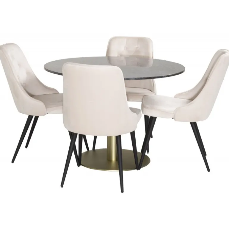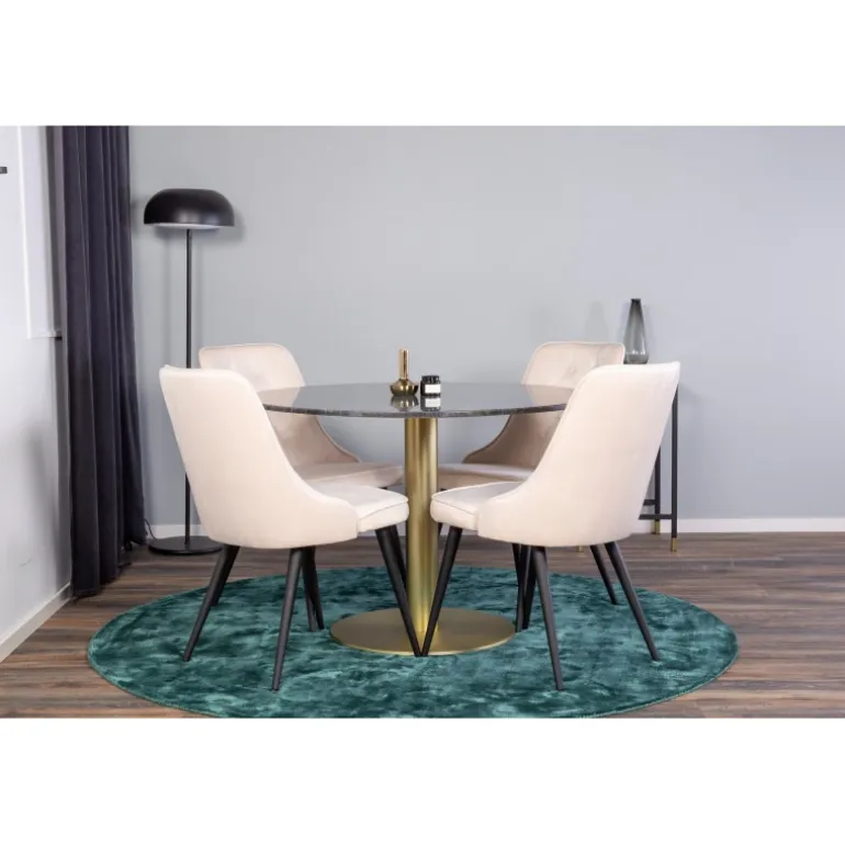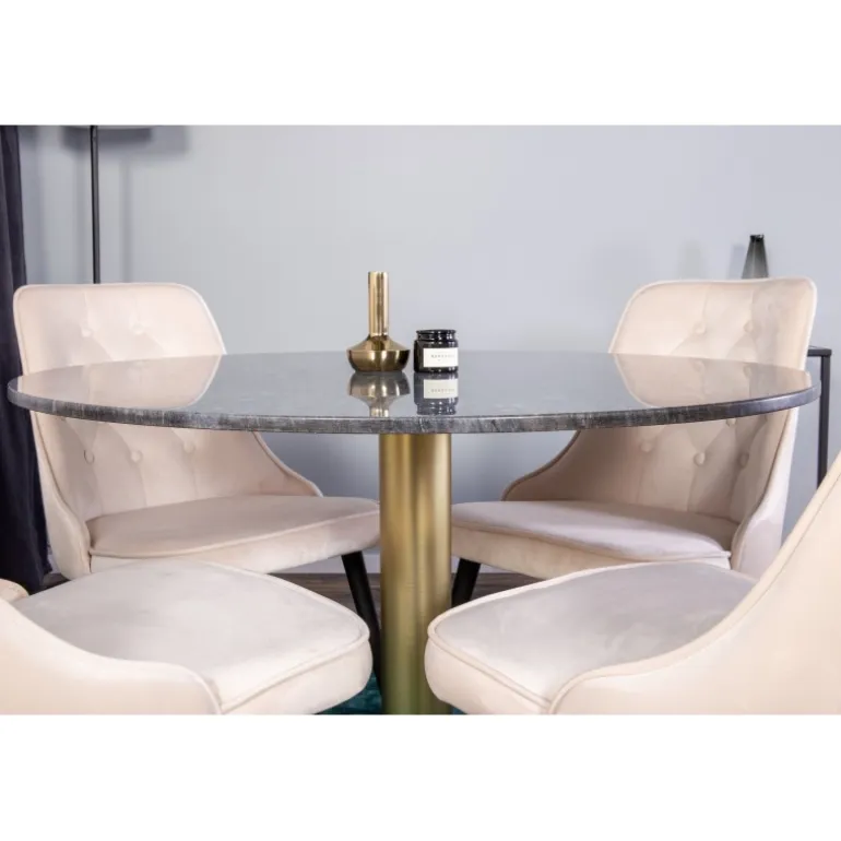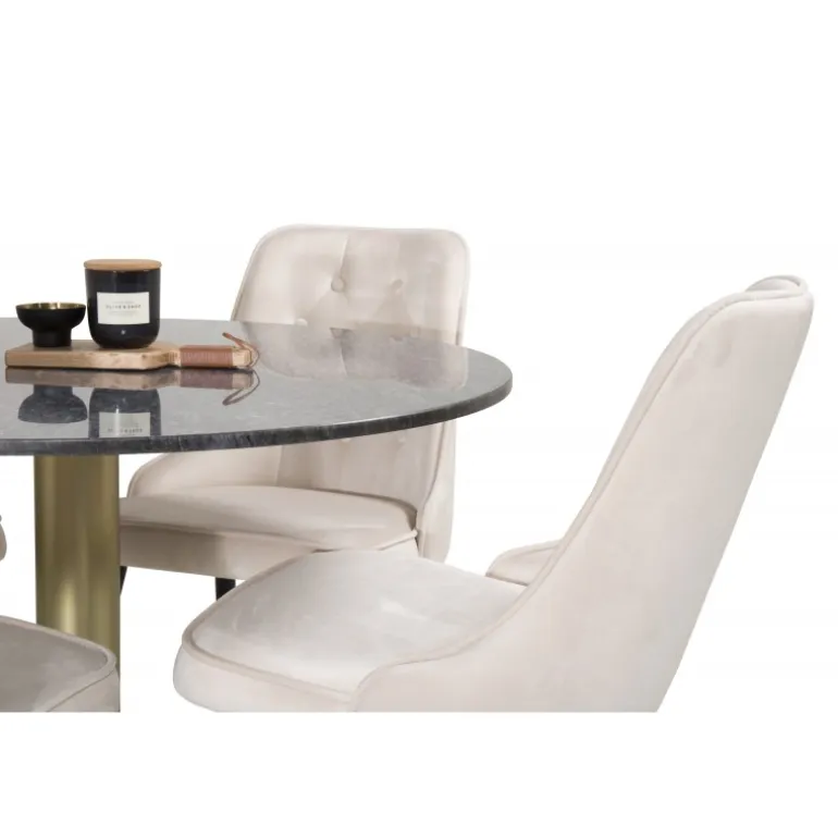 Spisebord Estelle i et slankt design, sammen med beige spisebordsstole Velvet – den perfekte kombination for dem, der ønsker en trendy Spisebordssæt. Høj siddekomfort på stolene inviterer til lange og vidunderlige øjeblikke for socialt samvær!