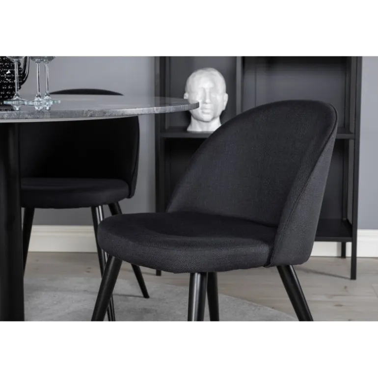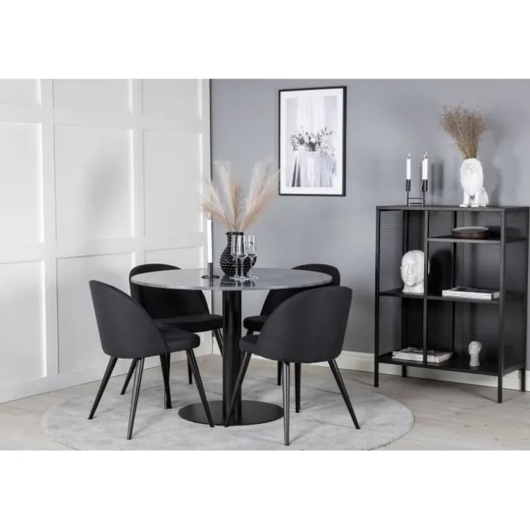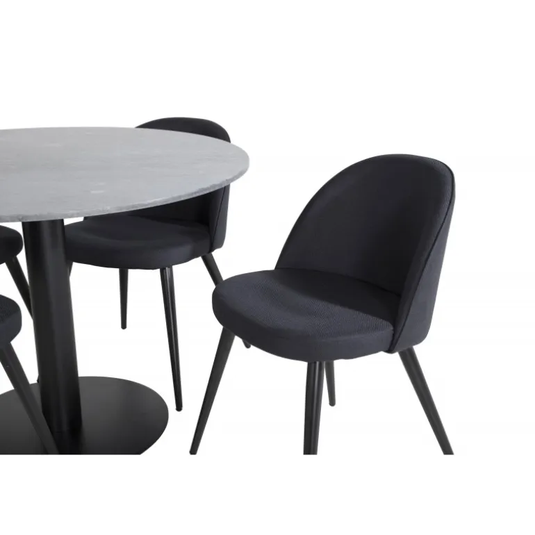 Estelle Rund Spisebordssæt kombinerer en stilfuld spisebord i smukt marmor fra Estelle-serien med bløde og komfortable spisestole fra Velvet-serien. Det elegante sorte design gør det til et ideelt valg for dem, der elsker at tilbringe tid ved bordet og nyde godt selskab. Bliv siddende i timevis og oplev en uforglemmelig spiseoplevelse med venner og familie!