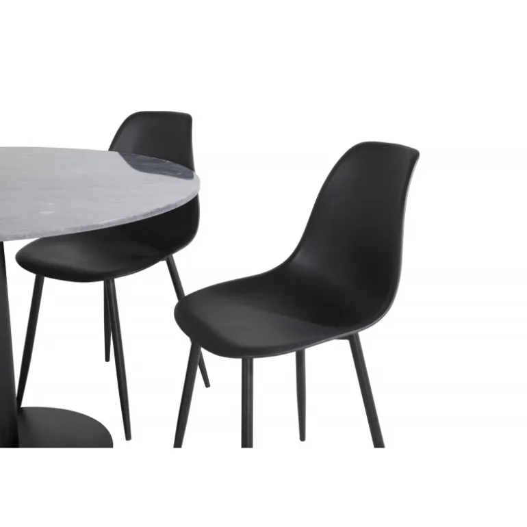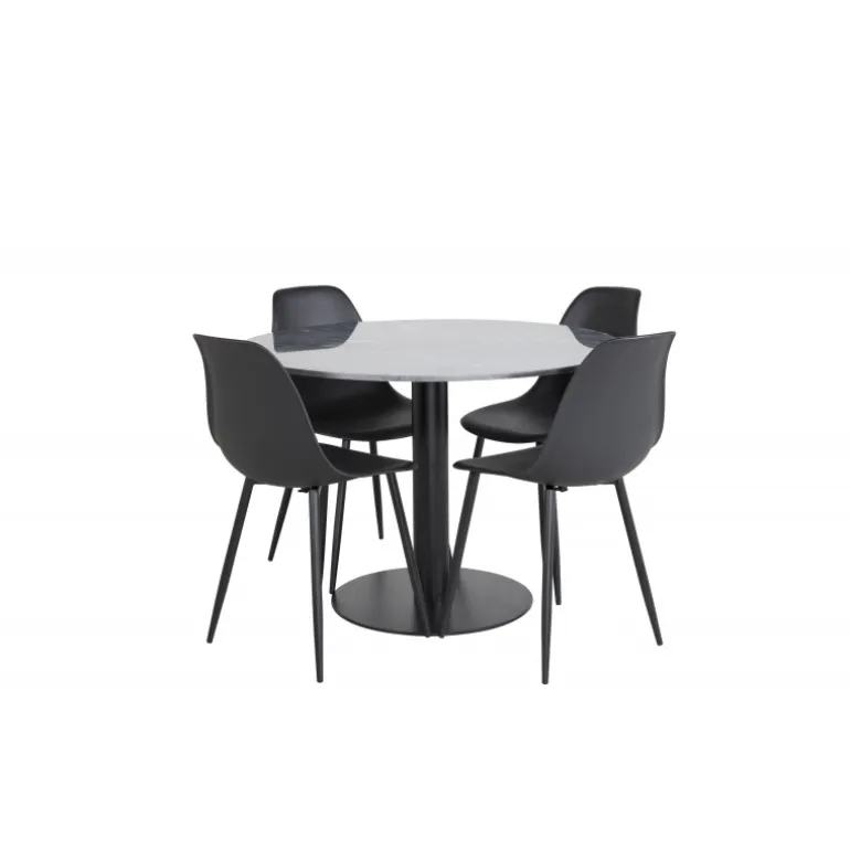 Med det stilfulde spisebord i smuk marmor fra Estelle-serien sammen med spisebordsstole fra Polar-serien får du en kombination af moderne, hyggelig og tidløs indretning! Dette sæt er perfekt til enhver spisestue, hvor du ønsker at skabe en indbydende og elegant atmosfære. Bordet har en mørkegrå marmorplade og robuste stålben, mens stolene er lavet af plastik og stål for maksimal holdbarhed.