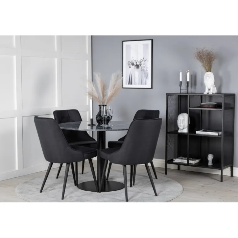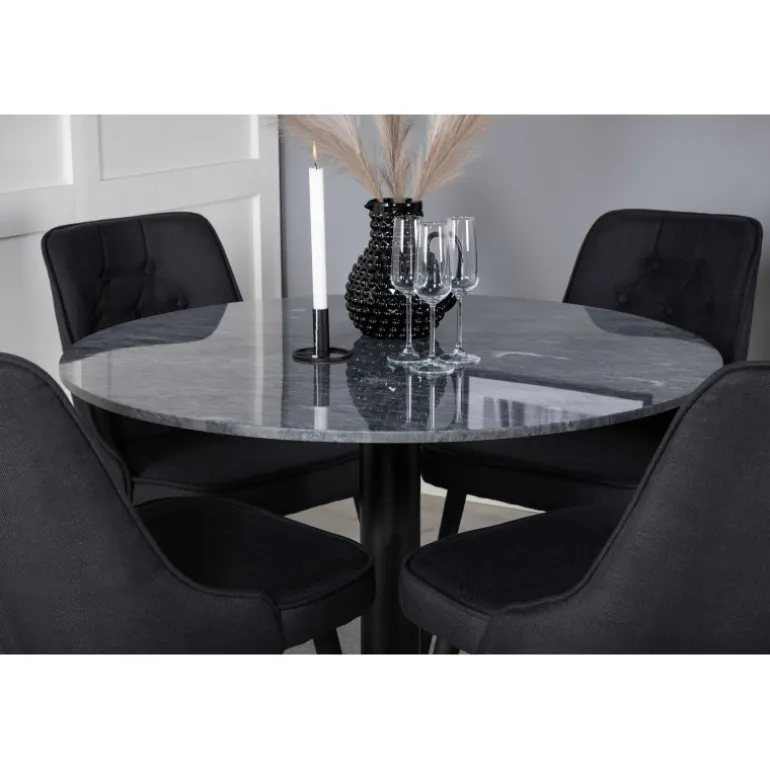 Oplev elegance og komfort med Estelle Rundt Spisebordssæt. Dette sæt inkluderer et smukt marmorbord og velvet-stole fra Velvet Deluxe-serien. Stole er robuste og behagelige, hvilket gør dem ideelle til lange aftener i godt selskab. Perfekt til at forbedre din spisestue med et stilfuldt og funktionelt møbel.