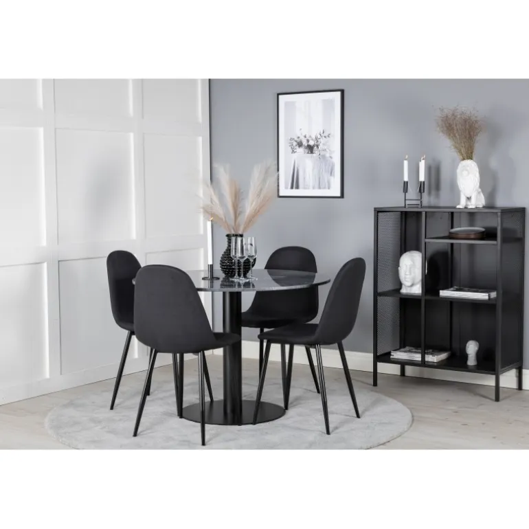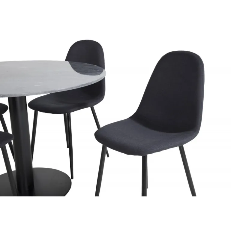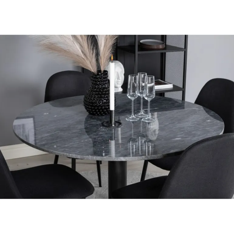 Et elegant spisebord med marmorbordplade i Estelle-serien kombineret med stilfulde stole fra Polar-serien. Dette Spisebordssæt er perfekt til dem, der ønsker at skabe en hyggelig og moderne stemning i hjemmet. Med sin sorte farve og høj kvalitet materialer som bøjet træ, skum, marmor og stål, giver dette sæt et sofistikeret look. Vær opmærksom på, at montering er påkrævet.