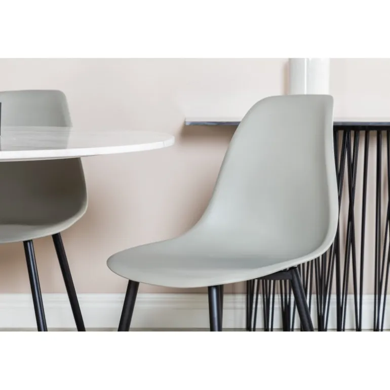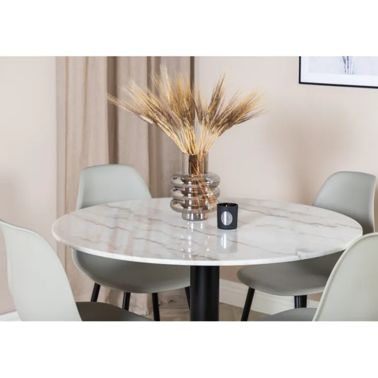 Det elegante marmorspisebord i Estelle-serien kombineres her med de tidløse stole i Polar-serien. Et Spisebordssæt at længes hjem til! Med et hvidt bordplade og grå stole, bringer dette sæt stil og funktionalitet til dit hjem. Marble og stål materialer sikrer holdbarhed, mens det rundt design skaber en indbydende atmosfære. Perfekt til intime middage eller større sammenkomster.