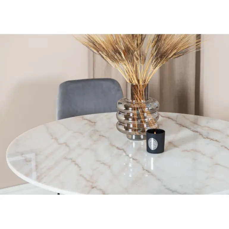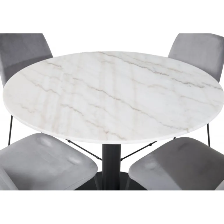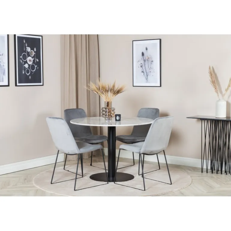 Oplev skønheden og funktionaliteten af Estelle Rundt Spisebordssæt. Dette elegante sæt består af et spiseligt bord i smukt hvidt marmor og stilfulde grå velourstole fra Muce. Perfekt til dem, der ønsker en trendy og sofistikeret Spisebordssæt. Estelle bordet er fremstillet med en robust stålramme, mens Muce stolene kombinerer bøjetræ, skum og stål for maksimal komfort og holdbarhed. Gør dit spiseområde til et stilfuldt midtpunkt med dette luksuriøse sæt.
