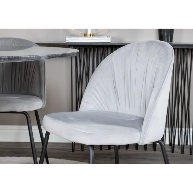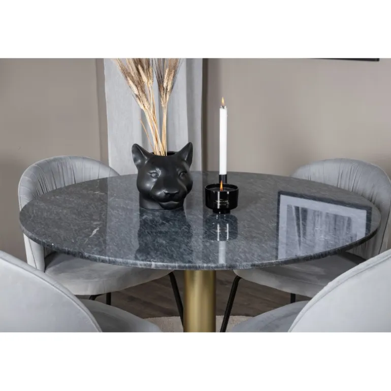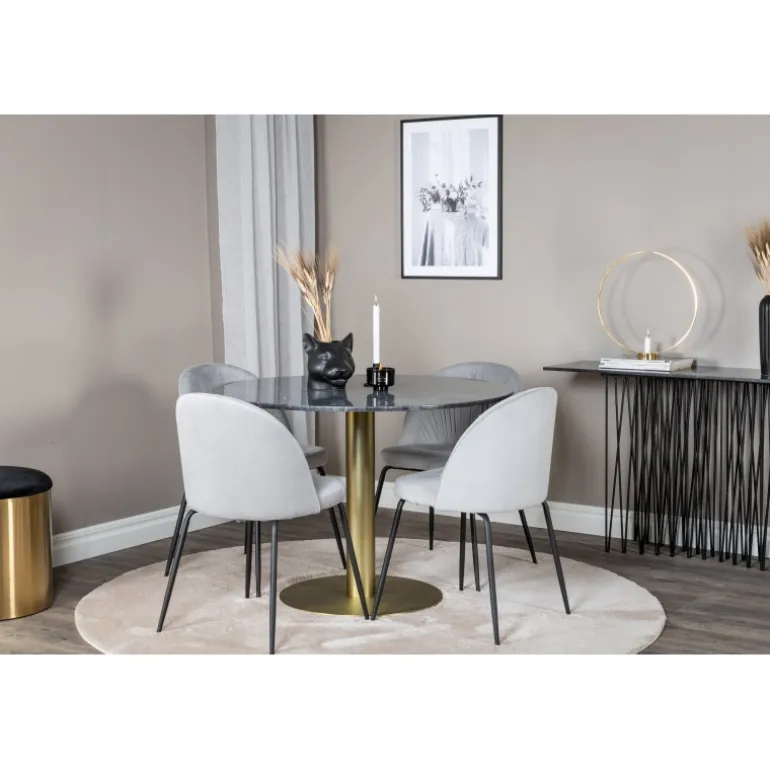 Estelle Rundt Spisebordssæt kombinerer en elegant spisebord i slankt design med stilfulde grå spisestole Wrinkles. Dette sæt er den perfekte kombination for dem, der søger en trendy Spisebordssæt til hjemmet. Bordet har en sort marmor bordplade og gyldne detaljer, mens stolene er lavet af bøjet træ, skum, og stål for maksimal komfort og holdbarhed. Gør dit spisested til et stilfuldt centrum med dette moderne og funktionelle sæt.