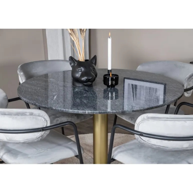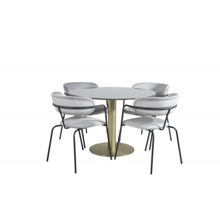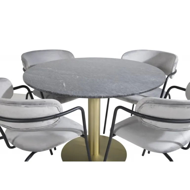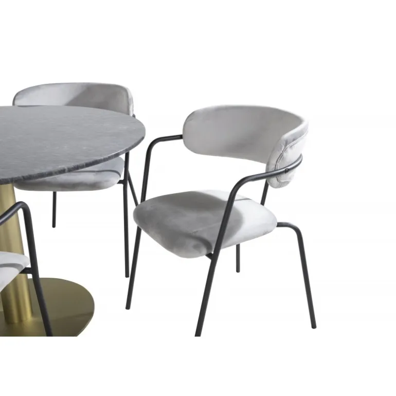 Spisebordet Estelle i et slankt design, sammen med Arrow spisestole – den perfekte kombination for dem, der ønsker en trendy Spisebordssæt. Den høje siddekomfort i stolene inviterer til lange og vidunderlige øjeblikke for socialt samvær!
