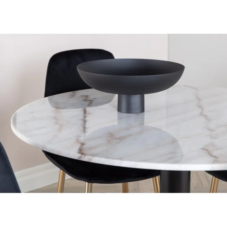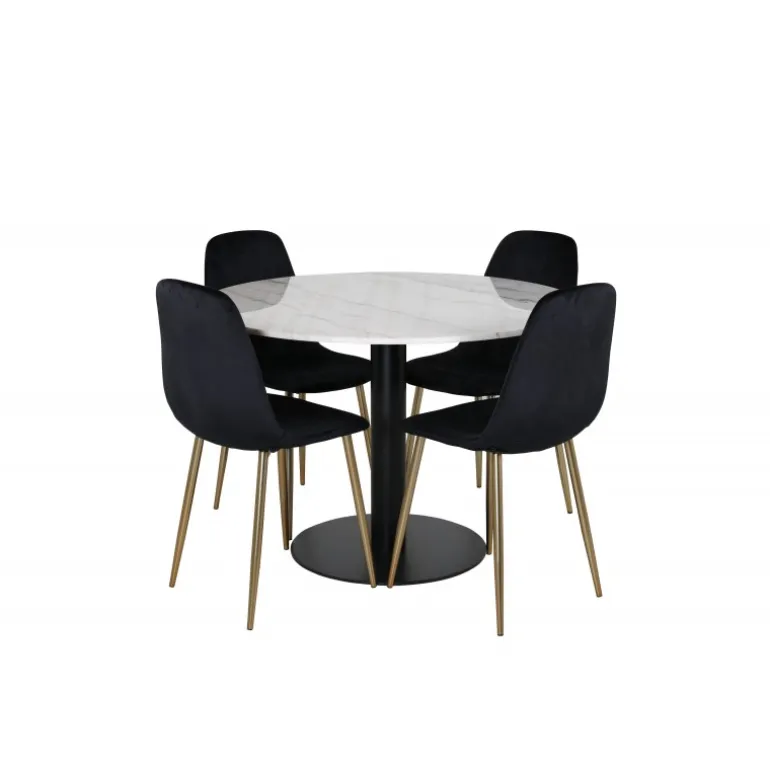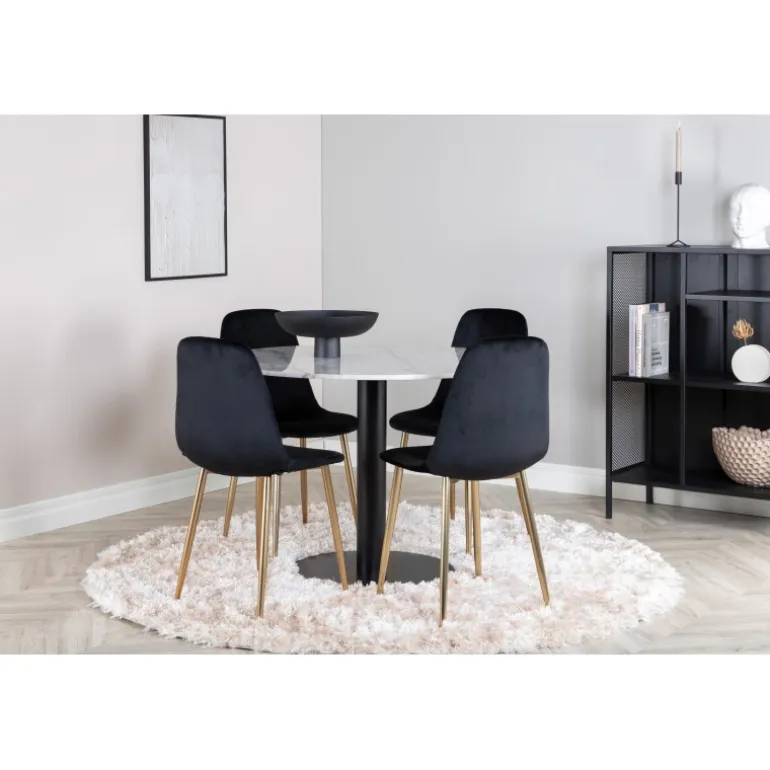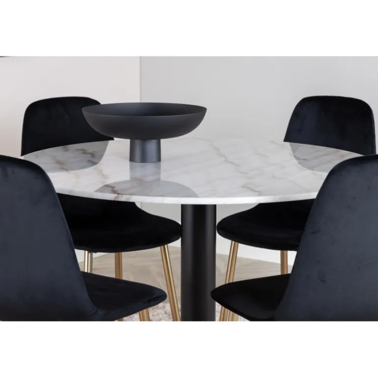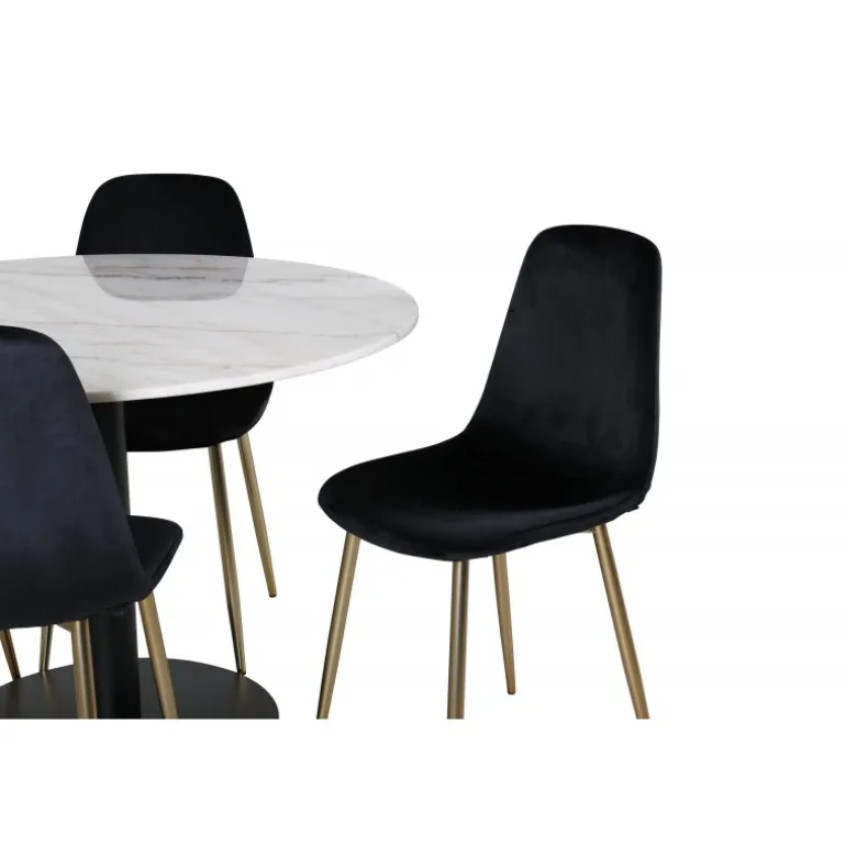 Vores moderne marmor-lignende spisestuebord Estelle sammen med komfortable sorte spisebordsstole i Polar-serien. Her får du et Spisebordssæt, der direkte udstråler luksus og elegance. Bordpladen i hvidt marmor-look kombineres smukt med sorte og guldfarvede detaljer, hvilket skaber et stilfuldt midtpunkt i din spisestue. De sorte stole med guldfarvede ben er både robuste og stilfulde, hvilket sikrer en behagelig siddeoplevelse. Perfekt til både hverdagsbrug og særlige lejligheder.