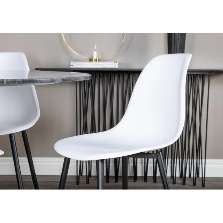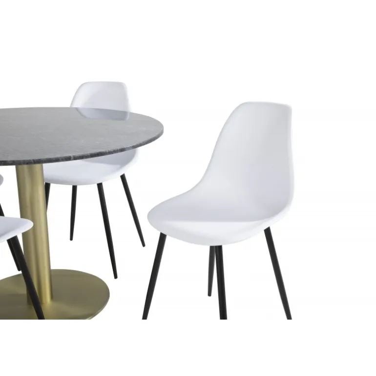 Estelle Rundt Spisebordssæt kombinerer en elegant marmorbordplade med tidløse stole fra Polar-serien. Dette smukke Spisebordssæt er perfekt til at skabe en stilfuld og social atmosfære i dit hjem. Med plads til god mad og hyggelige stunder, bliver dette sæt hurtigt centrum for dine sammenkomster. Bordet og stolene kommer i klassiske farver som sort, guld og hvid, hvilket gør det let at passe ind i enhver indretning. Bemærk, at dette sæt kræver montering.