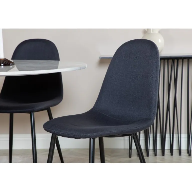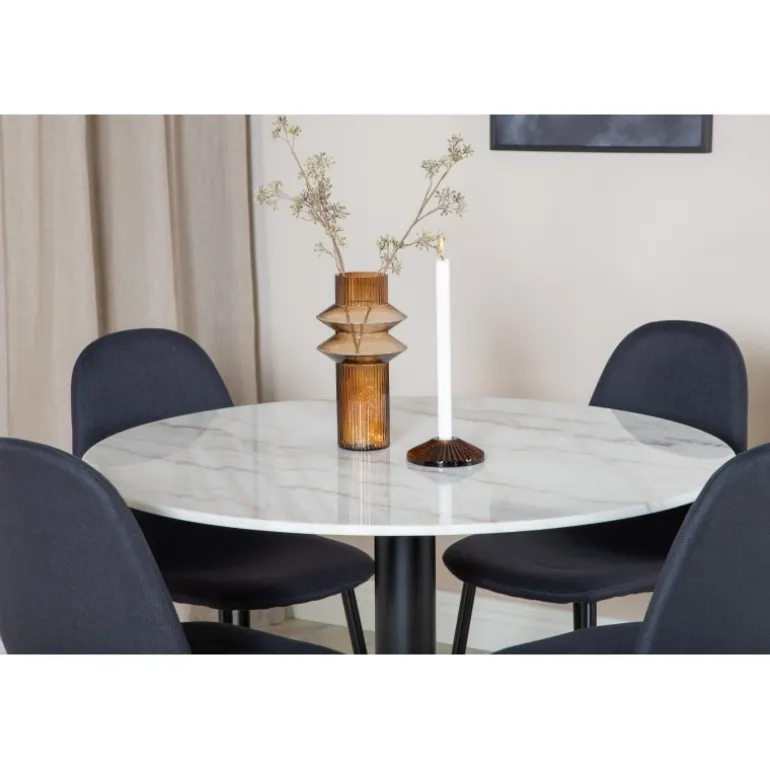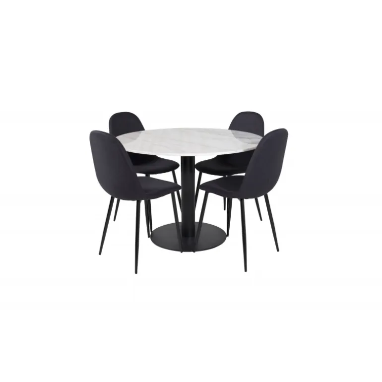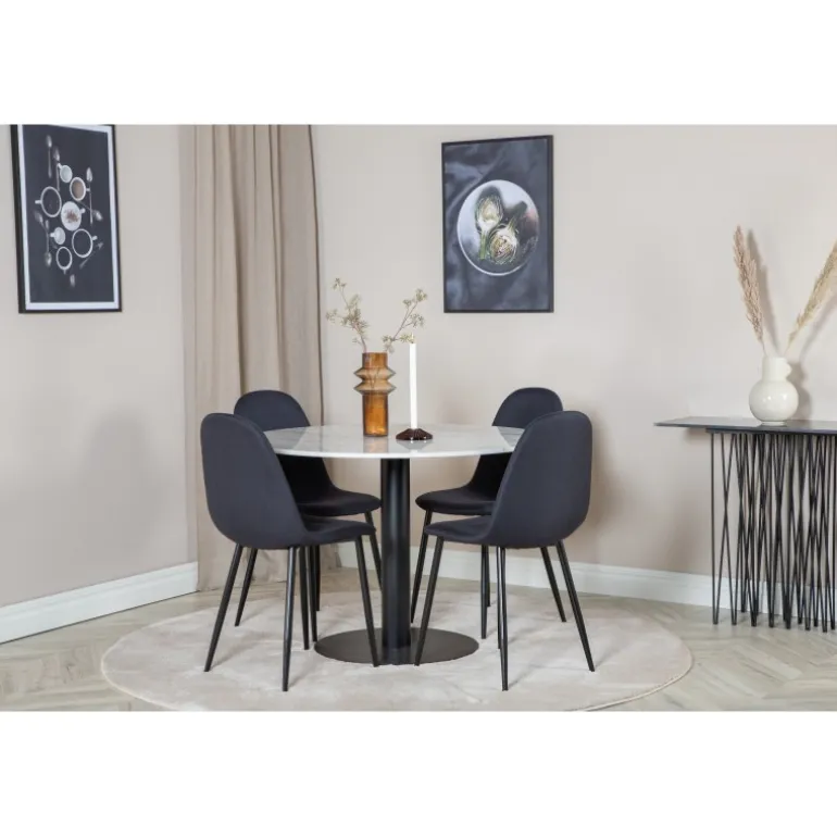 Estelle, et moderne rundt spisebord med en smuk marmor bordplade, giver en elegant og hyggelig atmosfære til dit hjem. Bordet er matchet med sorte stole fra Polar-serien, perfekt til dem, der ønsker at skabe en moderne og indbydende følelse. Dette Spisebordssæt er ideel til dig, der søger et stilfuldt og funktionelt møbel til din spisestue.