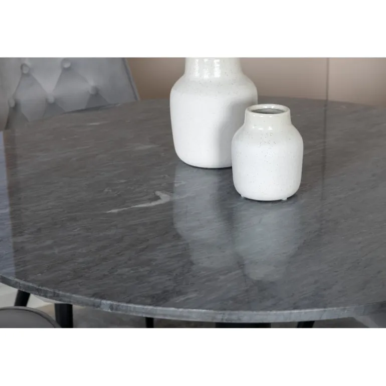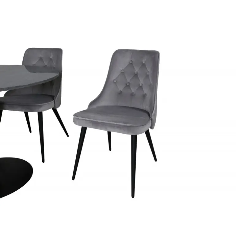 Opgrader din spisestue med det klassiske Estelle Rundt Spisebordssæt. Dette sæt kombinerer en elegant marmorbordplade med stilfulde stole fra Velvet-serien, hvilket skaber en hyggelig og moderne atmosfære i dit hjem. Bordet og stolene er fremstillet af materialer af høj kvalitet som marmor, krydsfiner og stål, hvilket sikrer både holdbarhed og æstetik. Den sorte bordplade og de lysegrå stole passer perfekt ind i enhver indretning. Samling kræves, men med klare instruktioner er det nemt at få dette sæt samlet og klar til brug.