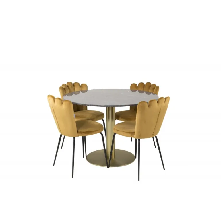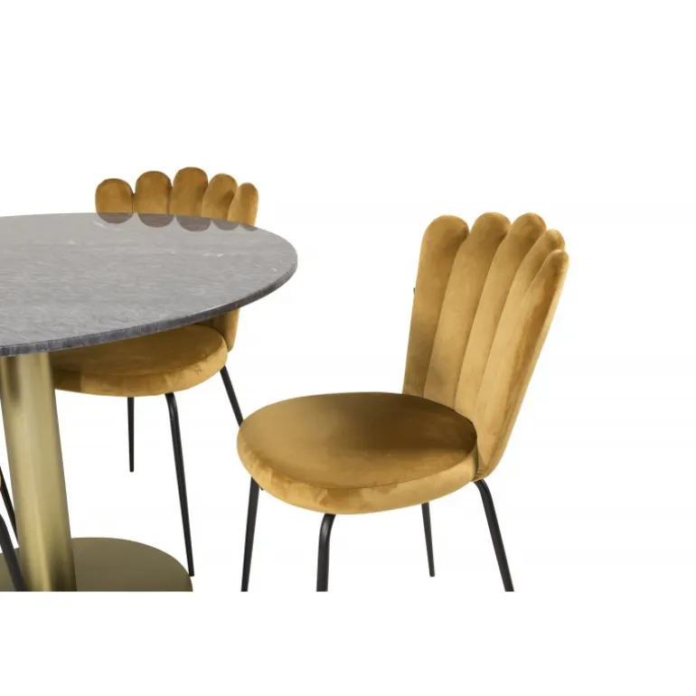 Oplev elegance og komfort med Estelle Rundt Spisebordssæt. Dette moderne marmorspisebord med en robust metalunderstel kombineres perfekt med de bløde gyldne fløjlstole fra Limhamn-serien. Sammen skaber de en luksuriøs og samtidig hyggelig atmosfære i dit hjem. Perfekt til både hverdagsmåltider og festlige lejligheder.