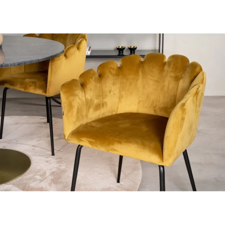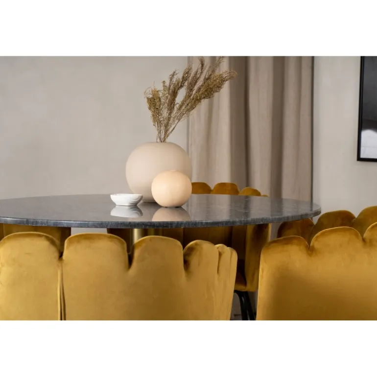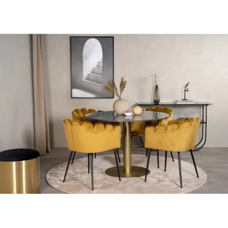 Sæt farver på hjemmet! Stilfulde marmorborde i serien Estelle sammen med vores smukke gyldne stole Limhamn. Her sidder du gerne længe og nyder godt selskab med venner!