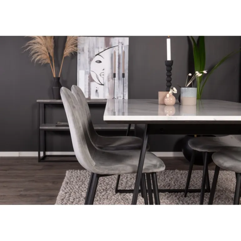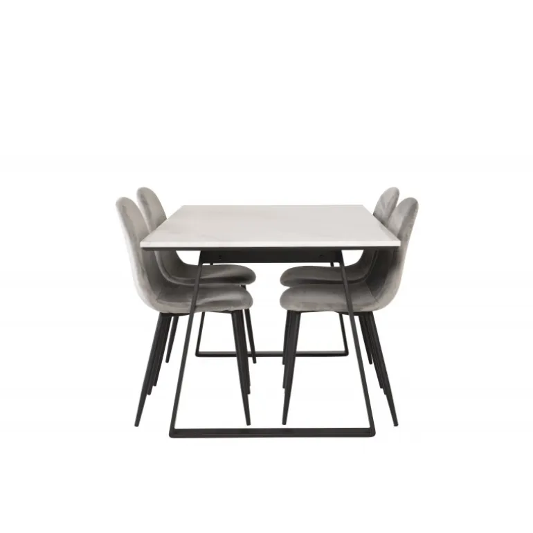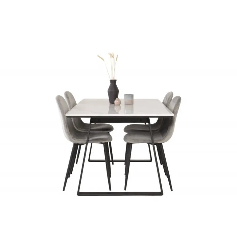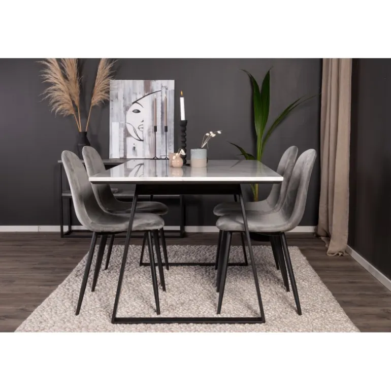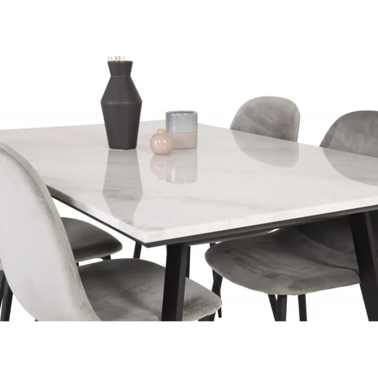 Vores lækre spisebord Estelle i en stilfuld marmorlignende look sammen med vores grå spisebordsstole Polar. “Klar til hverdag eller fest” med dette sæt, der nemt kan kombineres med andre dekorationer. Perfekt til både hverdagsbrug og festlige lejligheder! Montering påkrævet.