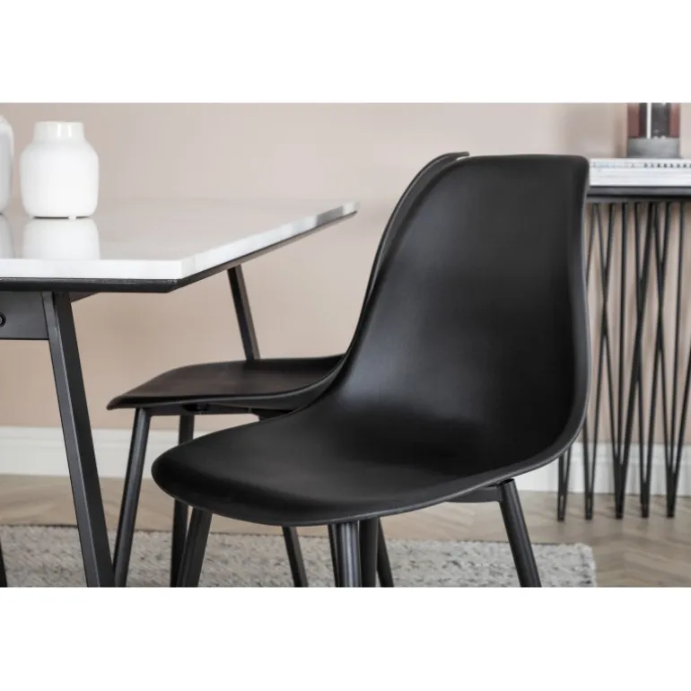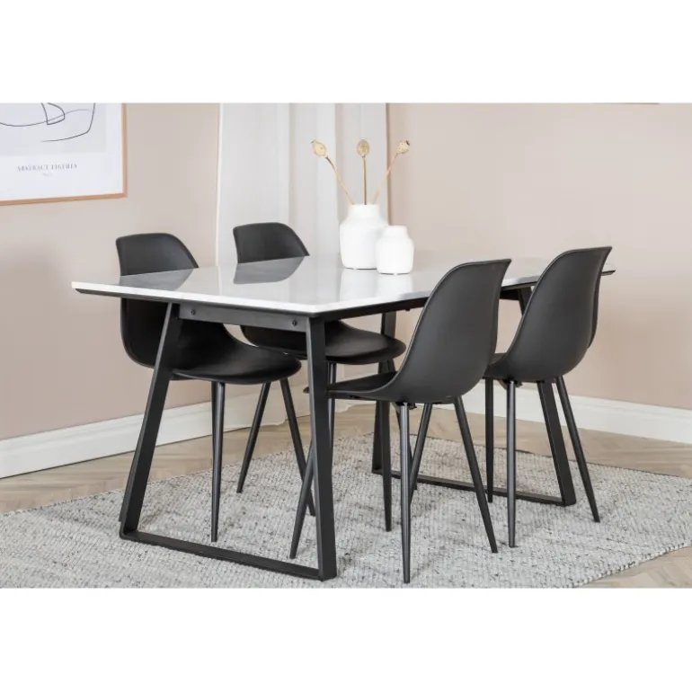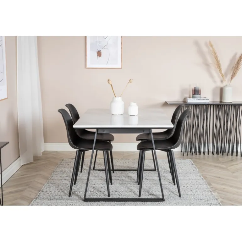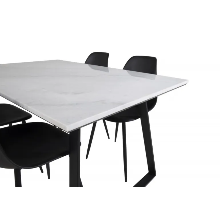 - Moderne design: Stilfuldt spisebordssæt med marmor bordplade og robuste stole.