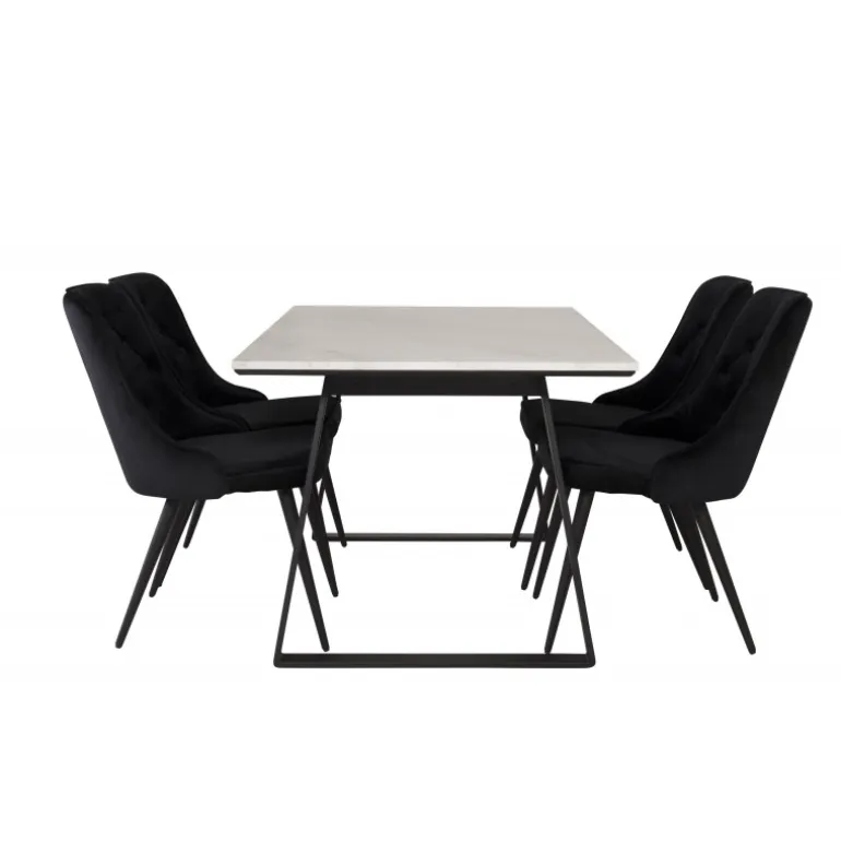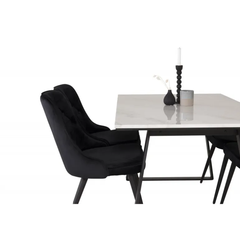 Estelle, et moderne og stilrent spisebord – her sammen med spisebordsstole fra Velvet-serien. Skab noget elegant og socialt med plads til god mad og hyggeligt samvær! Dette smukke sæt er perfekt til enhver spisestue, og dets marblede bordplade og robuste stålkonstruktion giver både stil og holdbarhed. Nem samling kræves for at nyde denne fantastiske spiseoplevelse.