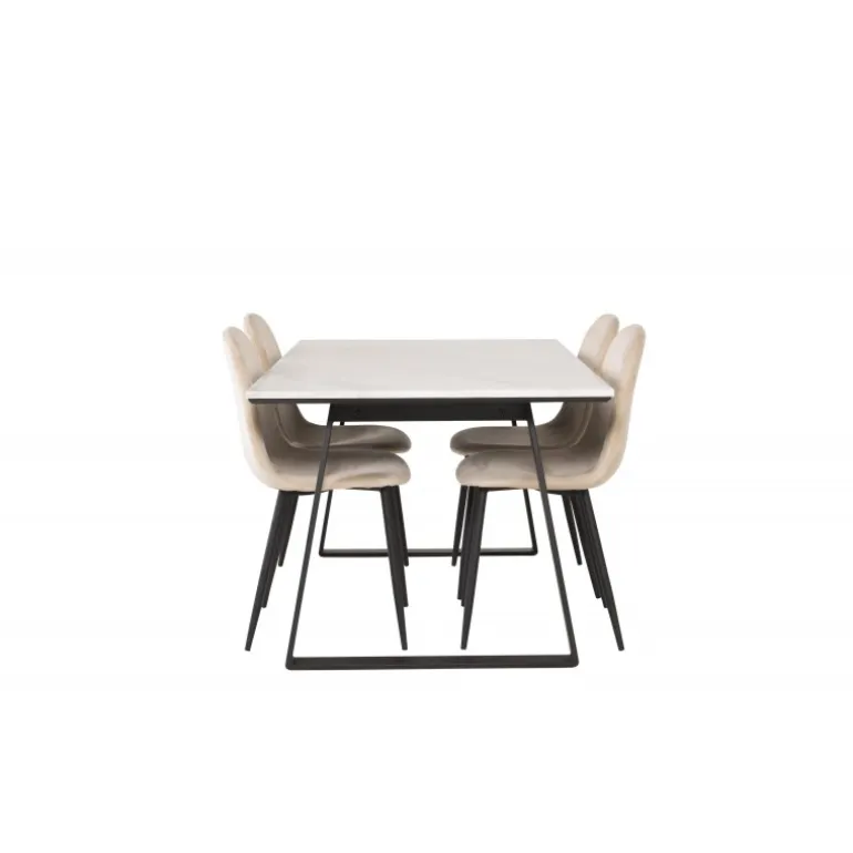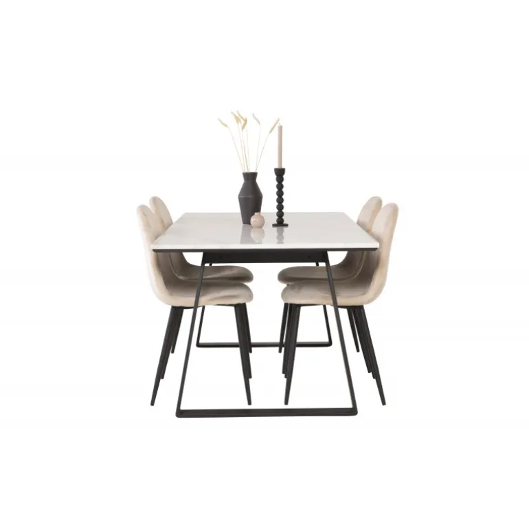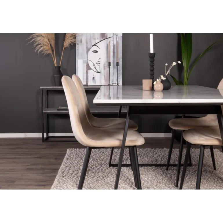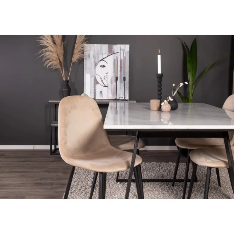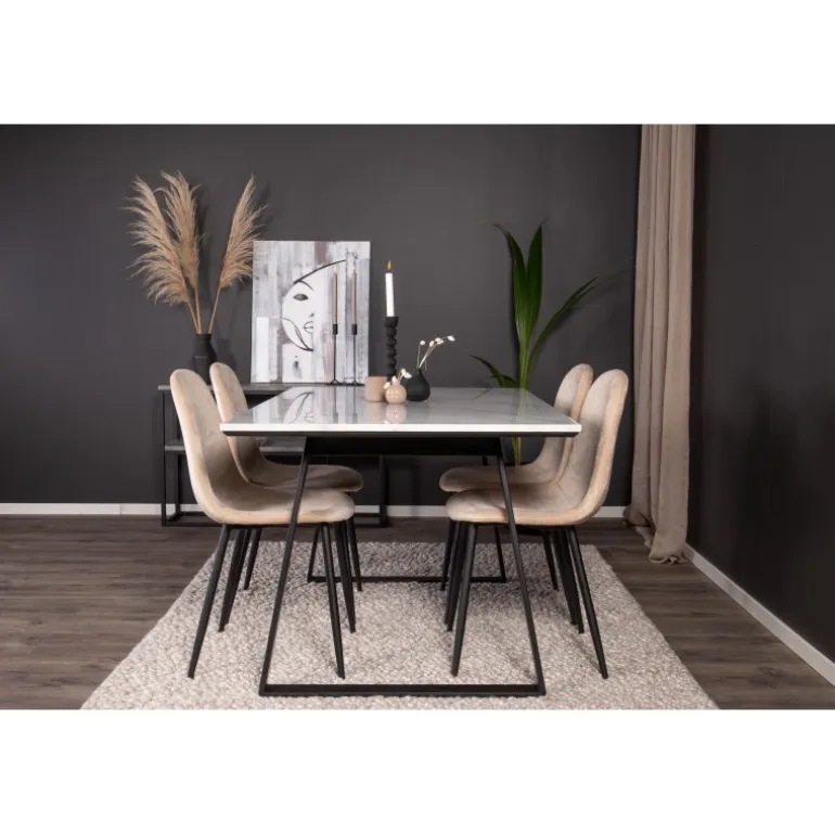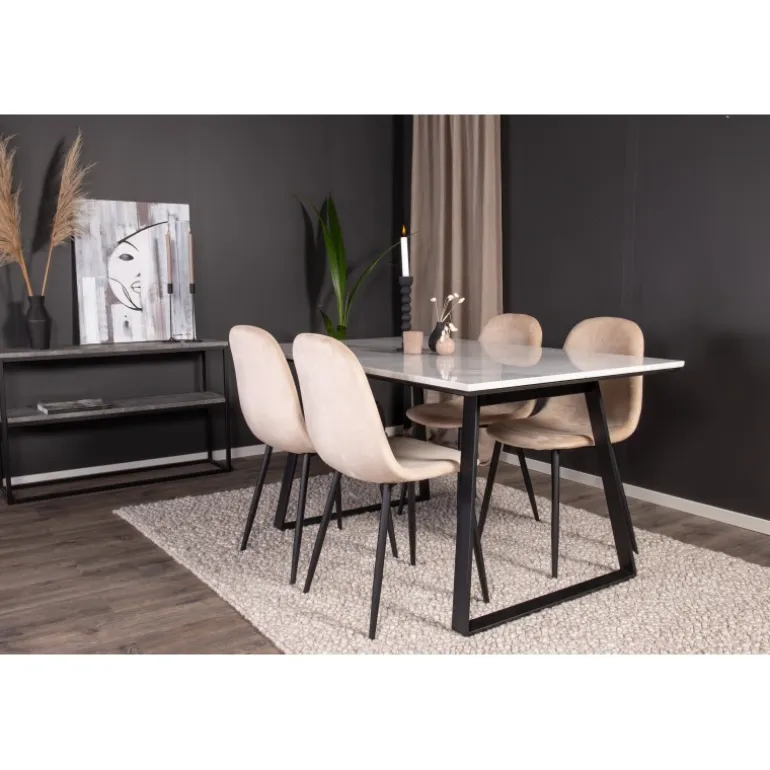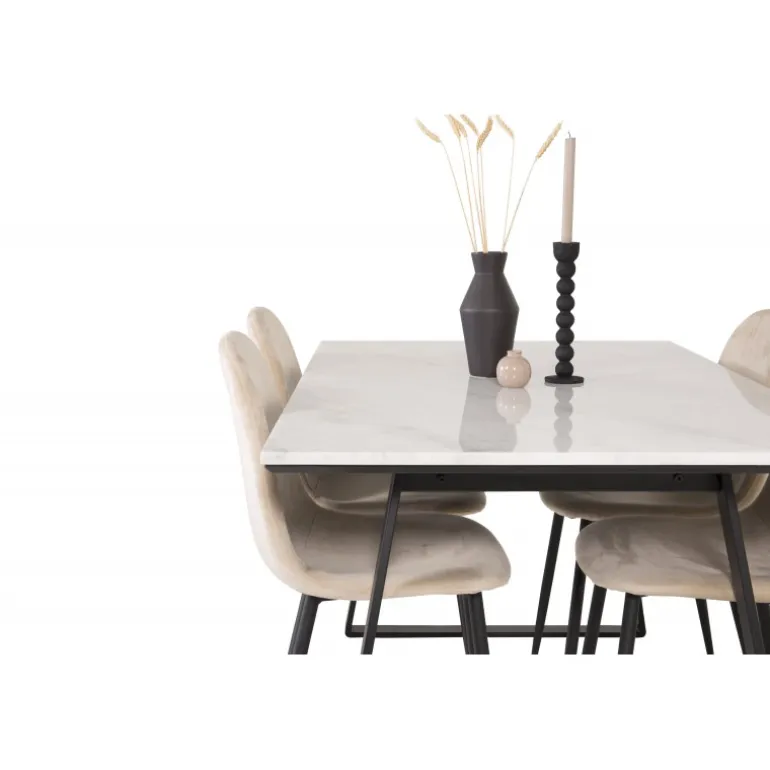Vores lækre Estelle Spisebordssæt i en stilfuld marmor-lignende finish sammen med vores beige Polar spisestole. “Dress up or down” dit spiseområde med andre dekorationer, perfekt til både hverdagsbrug og festlige lejligheder! Samling kræves.