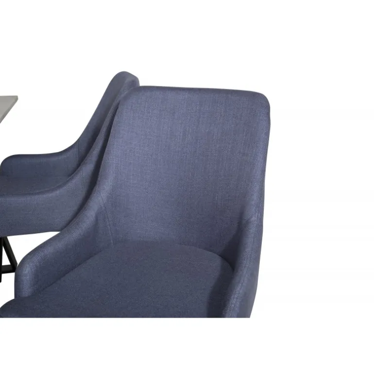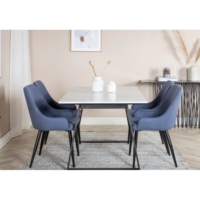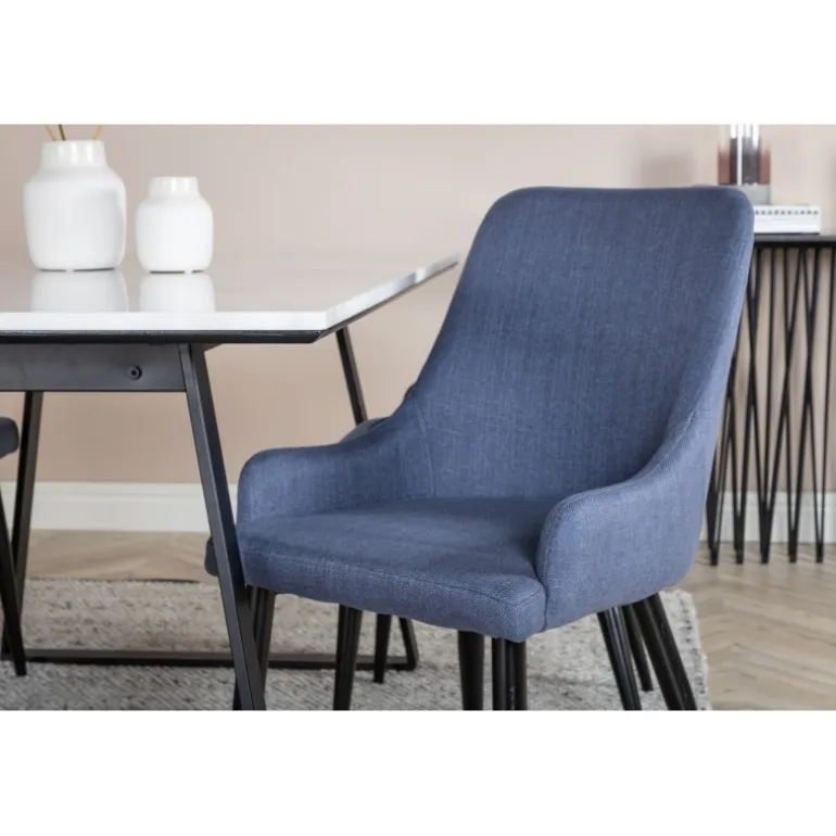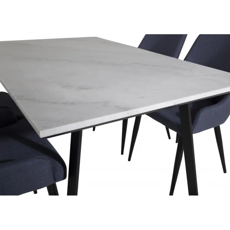 Estelle, et moderne og elegant spisebord – her sammen med spisestole i Plaza-serien. Skab noget stilfuldt og socialt med plads til god mad og hyggeligt samvær! Dette Spisebordssæt er perfekt til både hverdagsmåltider og særlige lejligheder. Bordpladen i marmor giver en luksuriøs følelse, mens stolene i bøgetræ, skum og stål sikrer komfort og holdbarhed. Tilgængeligt i farverne sort, blå og hvid, passer dette sæt ind i enhver moderne indretning.