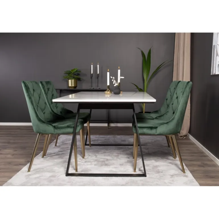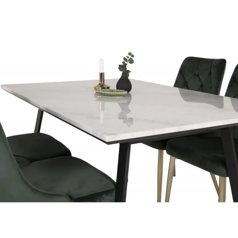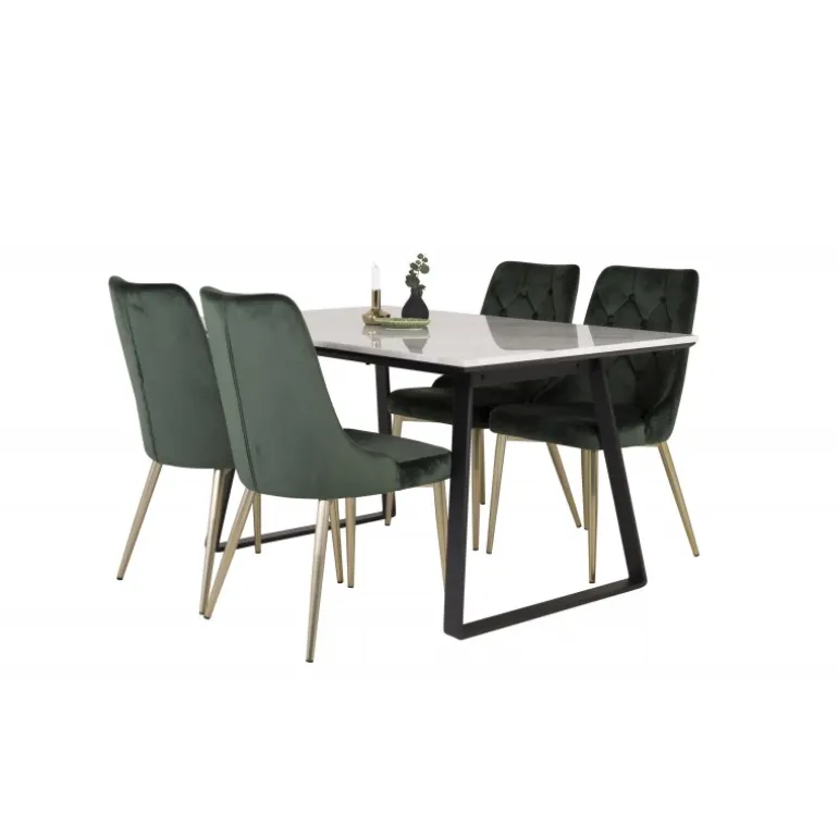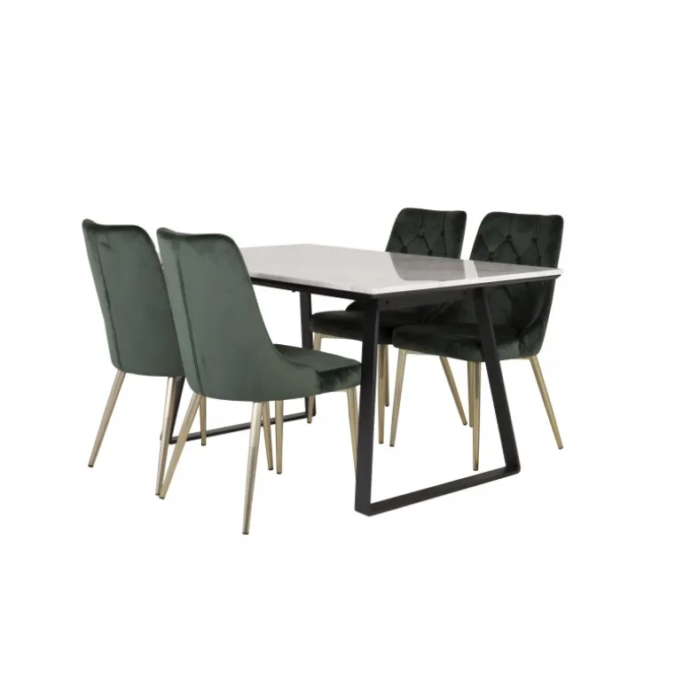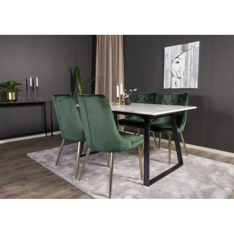 Det elegante marmor spisebord i Estelle-serien kombineres her med de bløde og komfortable stole fra Velvet-serien. Et spisebordssæt, der vil gøre enhver middag til en fornøjelse! Med sin raffinerede hvide bordplade og stilfulde design passer det perfekt ind i ethvert moderne hjem. De polstrede stole giver både komfort og stil, hvilket gør dette sæt ideelt til både hverdagsbrug og særlige lejligheder.