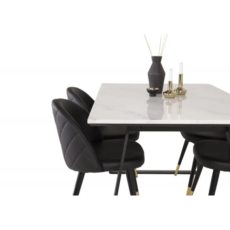Spisebordet Estelle i et slankt design, sammen med spiseborde Velvet – den perfekte kombination for dem, der ønsker en trendy Spisebordssæt. Stolens høje siddekomfort inviterer til lange og vidunderlige øjeblikke for socialt samvær! Dette elegante Spisebordssæt er ideelt til både formelle middage og afslappede sammenkomster. Bordpladen i marmor tilføjer et luksuriøst touch, mens det robuste stålstel sikrer holdbarhed og stabilitet.