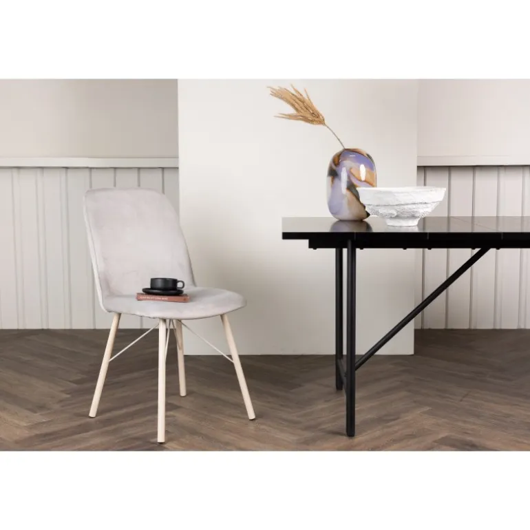 En drømmestol i lyse farver, der bidrager til en stilfuld og frisk atmosfære i dit hjem! EVERYDAY spisebordsstol har et fuldt polstret sæde i lysegrå velourstof, der giver en let og skinnende glans til øjet. Stolens ben er cylindriske og let udfladede i hvidvasket træ. Den perfekte spisebordsstol til det moderne hjem!