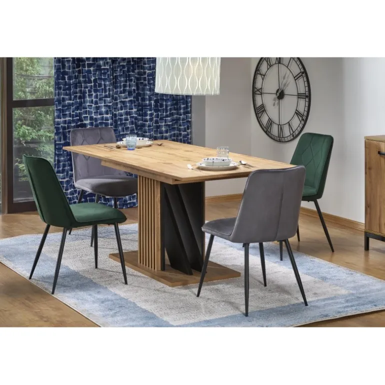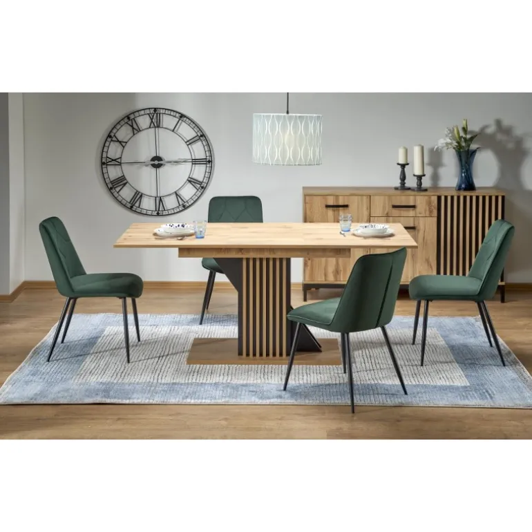 Oplev FABIANO Spisebord med udtræk i artisan eg og Sort, perfekt til at opgradere dit spisestueinteriør. Dette bord er lavet af lamineret spånplade, hvilket sikrer langvarig holdbarhed og let vedligeholdelse. Med dimensionerne 130-175/85/76 cm kan det nemt justeres for at passe til både små og store sammenkomster. Bordets top er i elegant wotan eg, mens benene kombinerer wotan eg og Sort for et moderne udseende. Hvert bord leveres i én kasse med en netto vægt på 49.500 kg og en brutto vægt på 50.000 kg.