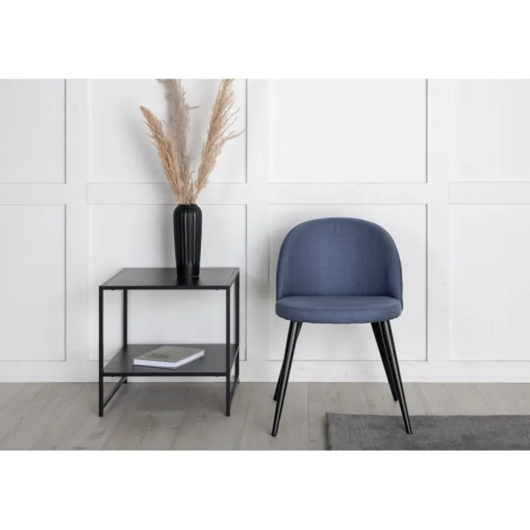 Indret hjertet af dit hjem med en behagelig blå nuance med spisebordsstole fra Fløjls serien. Det stilfulde design gør stolene nemme at matche med et hyggeligt spisebord. Ryglæn og sæde er polstret i blåt polyesterstof, og benene er lavet af sort pulverlakeret metal. Nogle samlinger kræves. Nyd behagelige måltider fremover! Plejeinstruktioner: Brug stofspray til at imprægnere stoffet før brug, hvilket også gør det lettere at fjerne snavs og pletter i fremtiden. Fjern pletter straks, gnid ikke, men forsøg forsigtigt at absorbere dem med en klud.