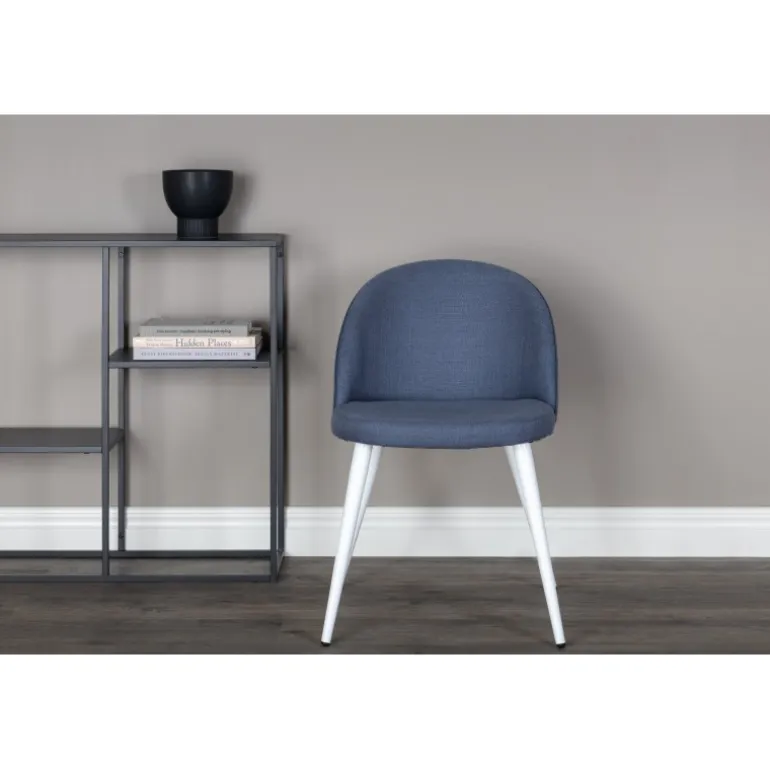 Dekorér hjemmets hjerte i en behagelig blå nuance med spisestole fra Fløjls-serien. Det stilfulde design gør stolene nemme at matche med et hyggeligt spisebord. Ryg og sæde er betrukket med blåt polyesterstof og benene er i hvidt pulverlakeret metal. Lettere samling kræves. Nyd behagelige måltider forude! Plejeråd: Brug tekstilspray til at imprægnere stoffet, før du begynder at bruge det, det vil også gøre snavs og pletter nemmere at fjerne i fremtiden. Fjern pletter med det samme, gnid ikke, men prøv at suge forsigtigt op med en klud.
