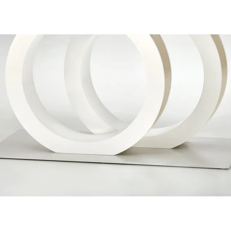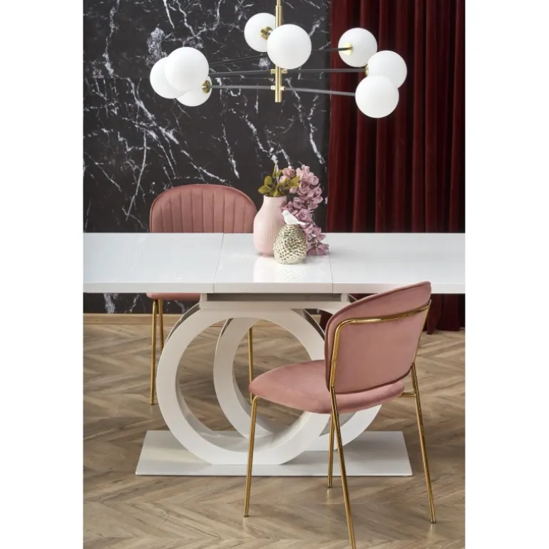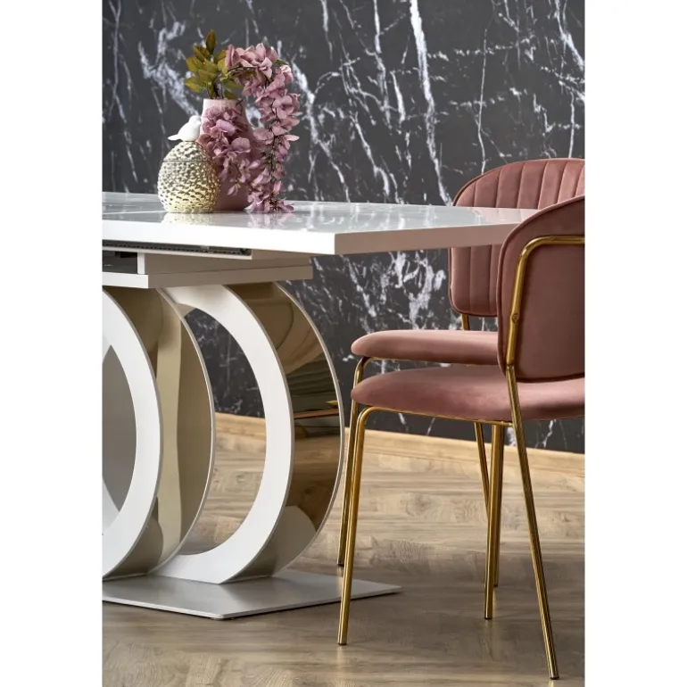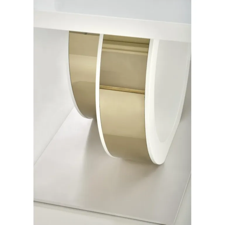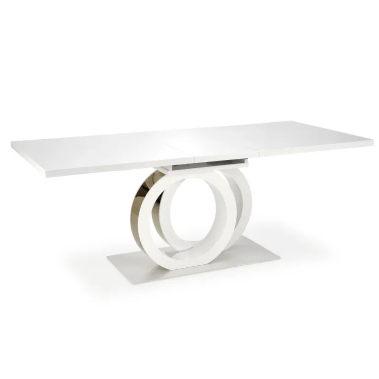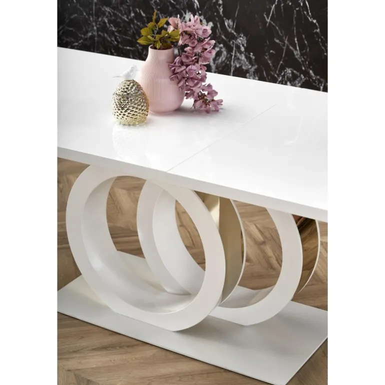 Opgrader dit hjem med det elegante GALARDO Spisebord med udtræk i hvid og guld. Med dimensionerne 160-200/90/76 cm er dette bord perfekt til både små sammenkomster og større middage. Spisebord med udtræket er fremstillet af lakeret MDF finer og rustfrit stål, som sikrer både holdbarhed og stil. Den pulverlakerede stålramme giver ekstra stabilitet, mens den sofistikerede farvekombination af hvid og guld tilføjer et luksuriøst touch til dit interiør.