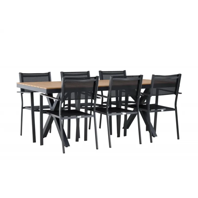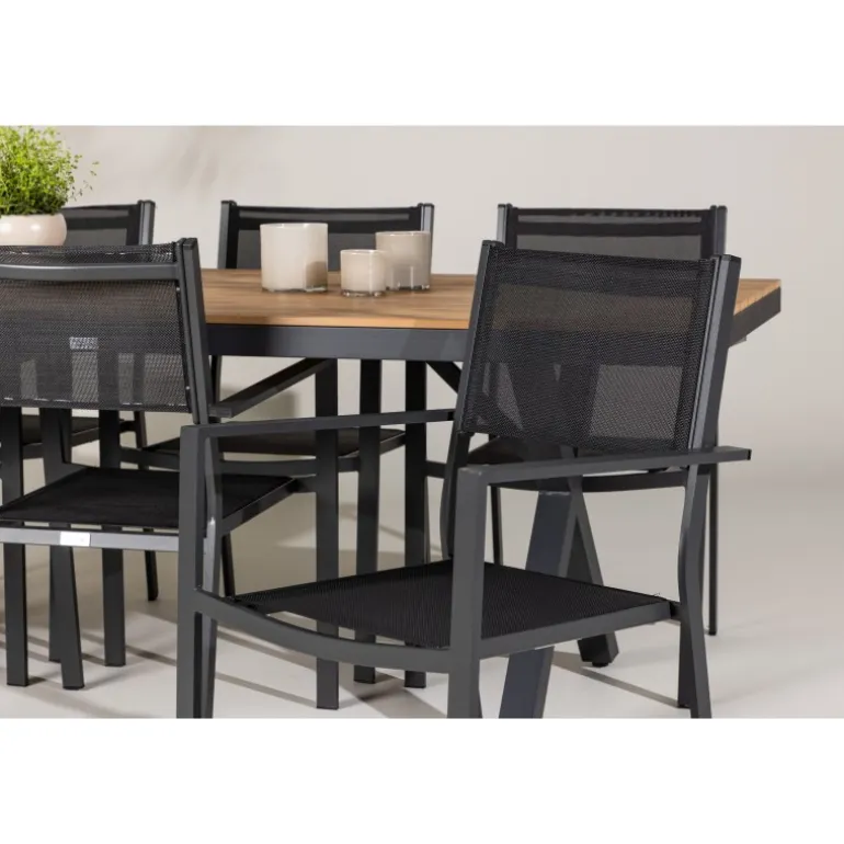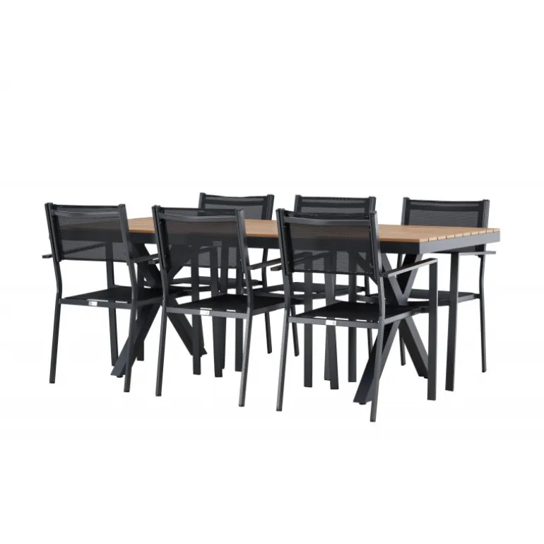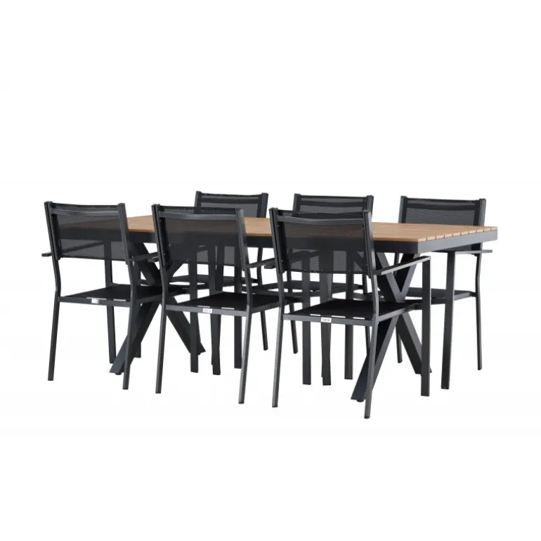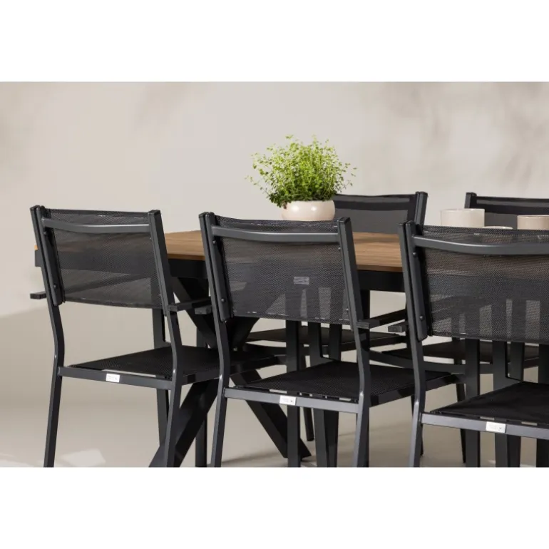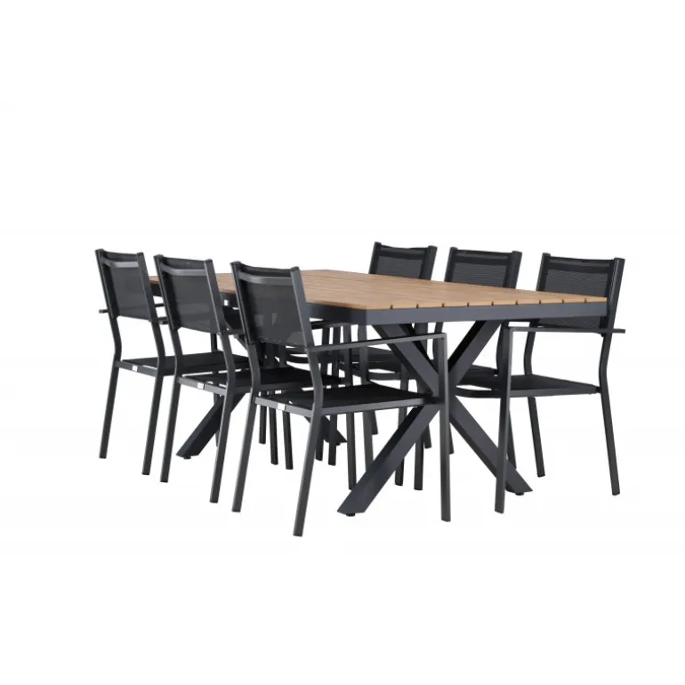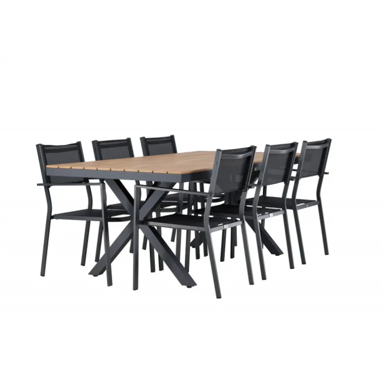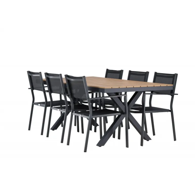 Oplev det perfekte Loungesæt – Havemøbelsæt til din udendørs plads med vores elegante ensemble bestående af Garcia-bordet og Copacabana-stolene. Garcia-bordet er midtpunktet i din udendørs spiseoplevelse med generøse dimensioner på 100×200 centimeter. Fremstillet af aluminium i en smuk brun nuance, udstråler dette bord stil, der sømløst smelter ind i dit udendørs miljø. Copacabana-stolene er det ultimative supplement til Garcia-bordet. Fremstillet af aluminium i en elegant sort farve, tilbyder disse stole både stil og komfort til din udendørs afslapning. Med seks medfølgende stole er dette Loungesæt – Havemøbelsæt perfekt til at samle familie og venner til mindeværdige øjeblikke under åben himmel. Giv din udendørs plads den perfekte atmosfære til spisning og afslapning med vores Garcia og Copacabana Loungesæt – Havemøbelsæt.