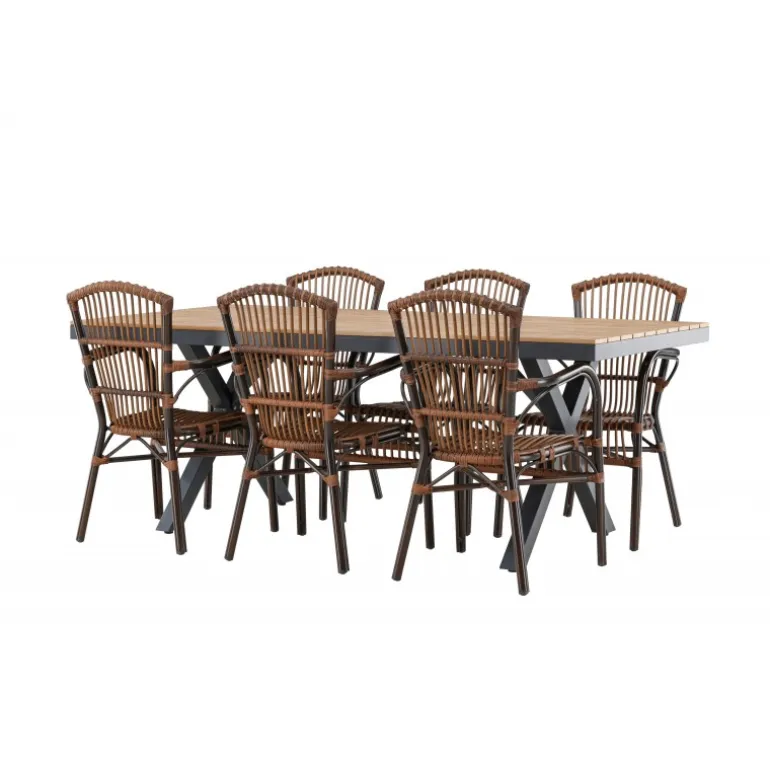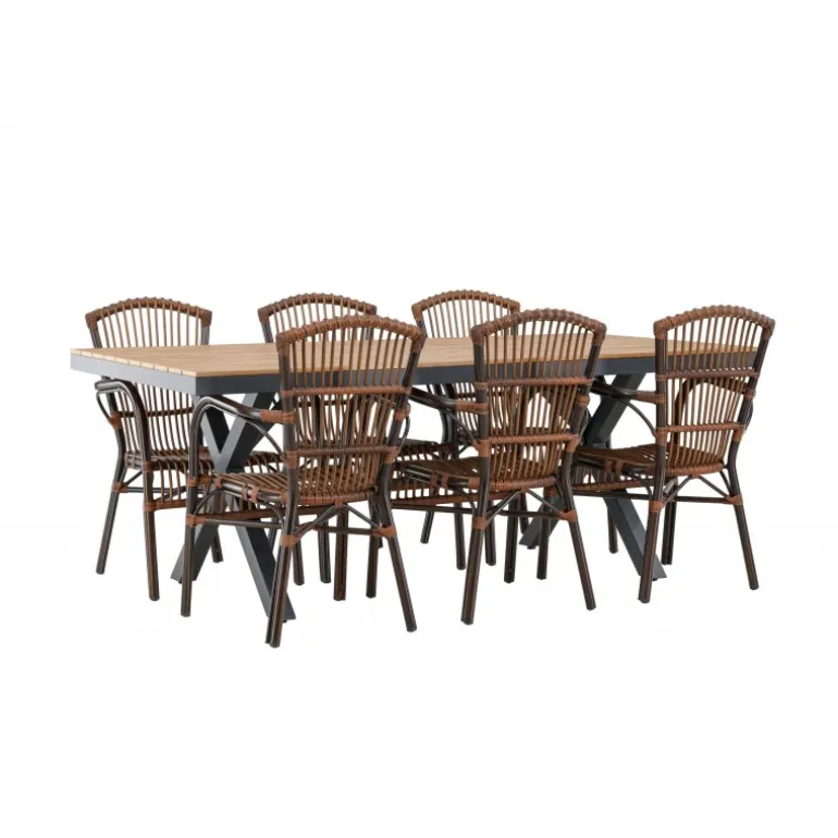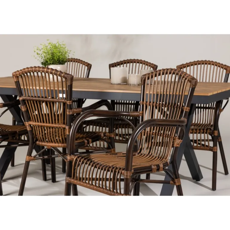 Oplev det perfekte sted for at samles med venner og familie med vores nye Loungesæt – Havemøbelsæt – Galera og Garcia. Med en atmosfære af venskab og fællesskab løfter dette ensemble dit udendørsmiljø til nye højder. Galera-stolene er designet til at kombinere stil og komfort sømløst. Deres brune rattan-sæder giver et rustikt præg, mens aluminiumsbenene giver stabilitet. Disse stole er skabt til at være både trendy og komfortable, ideelle til længere udendørs sammenkomster. Garcia-bordet er midtpunktet i dette Loungesæt – Havemøbelsæt med sine generøse dimensioner på 200×74 cm. Med en bordplade i brun finer og en base i sort aluminium tilbyder det et moderne og trendy design, der passer perfekt ind i nutidens udendørsmiljøer. Dette Loungesæt – Havemøbelsæt er perfekt til udendørs brug og bringer en trendy og moderne atmosfære til din have eller terrasse. Med seks stole inkluderet er dette sæt komplet til at skabe mindeværdige øjeblikke og nyde selskabet udendørs.