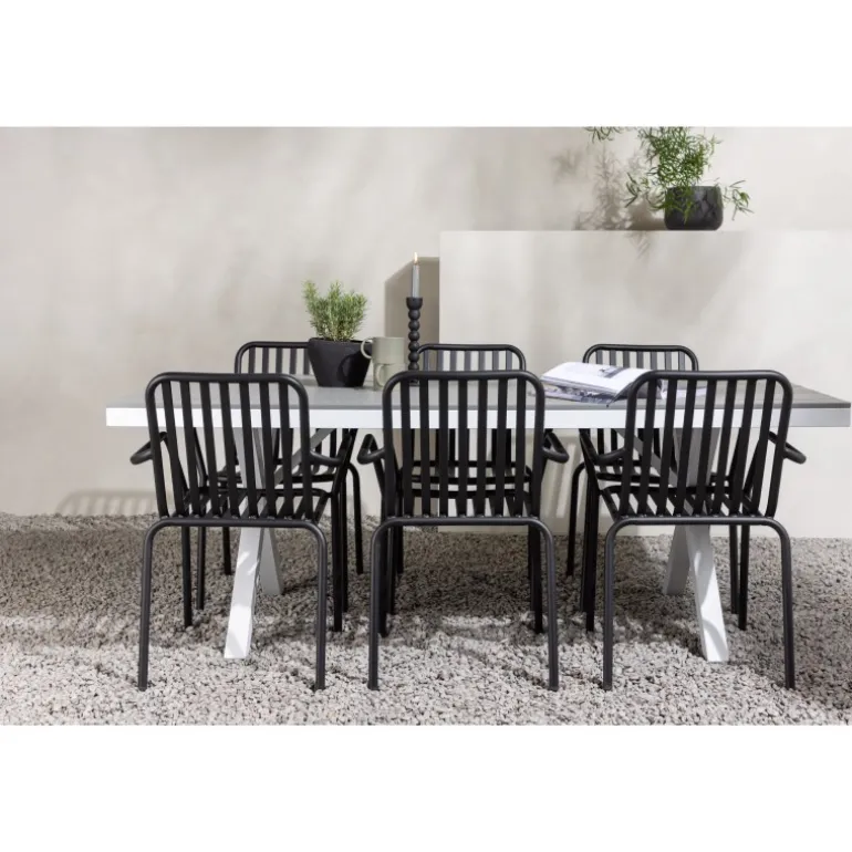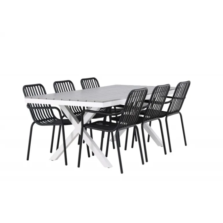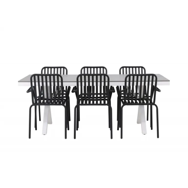 Et Loungesæt – Havemøbelsæt som virkelig er en øjefanger! Vores rektangulære spisebord Garcia har et klassisk design med en bordplade i smagfuld aintwood og krydsede bordben i hvidt aluminium. Her sammen med vores dejlige spisebordsstole fra Beijing-serien. Stolens ribbede design og sodfarvede sorte farve gør den både moderne og tidløs. Fremstillet af aluminium, hvilket gør den let at flytte rundt og har integrerede armlæn for ekstra komfort. Her kan du sidde i flere timer og nyde din terrasse! Bordets mål: 200x100cm.