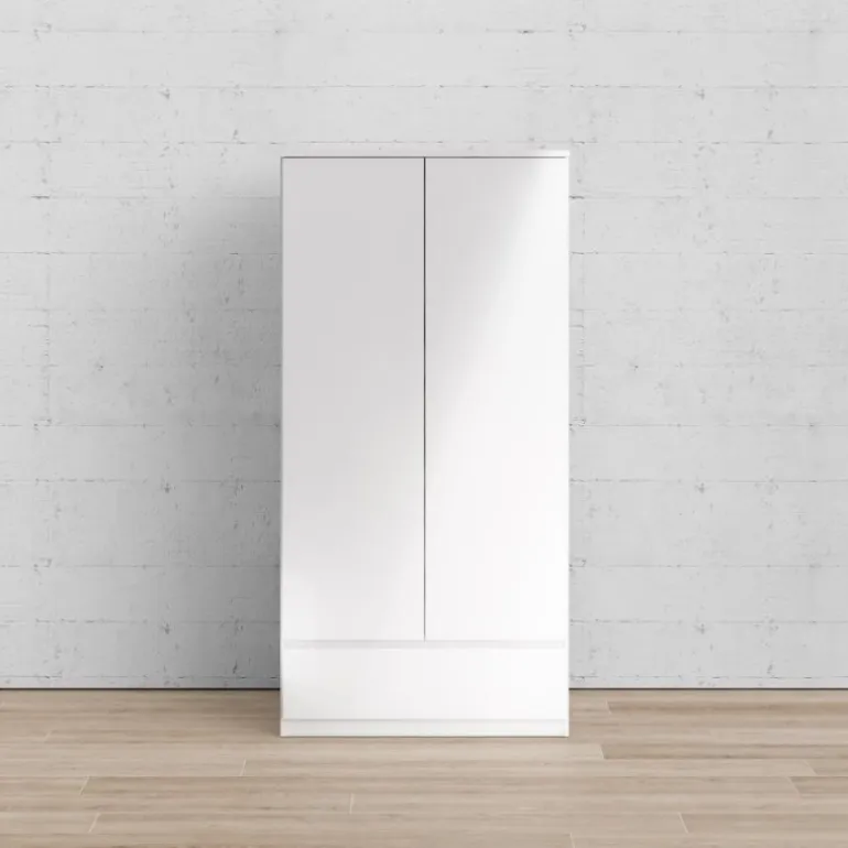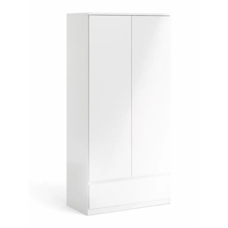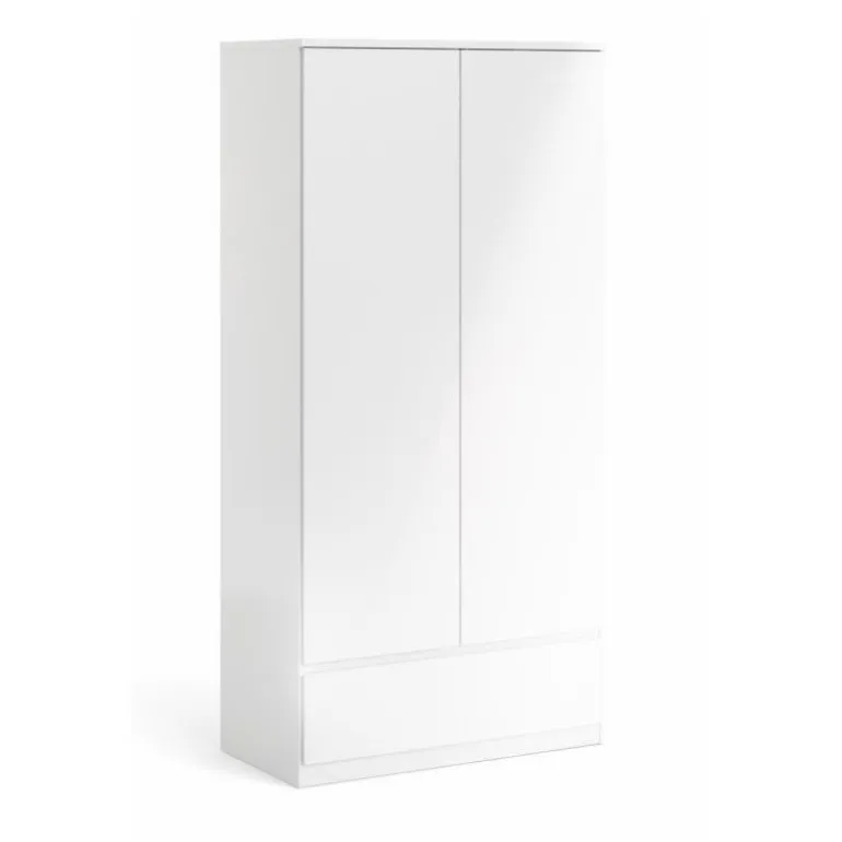 Rummeligt klædeskab i hvid højglans med 2 fløje og 1 skuffe i bunden. Skabet bliver yderst praktisk til opbevaring med sin store skuffe i bunden, og der er god plads til alt dit tøj med dette høje skab.
