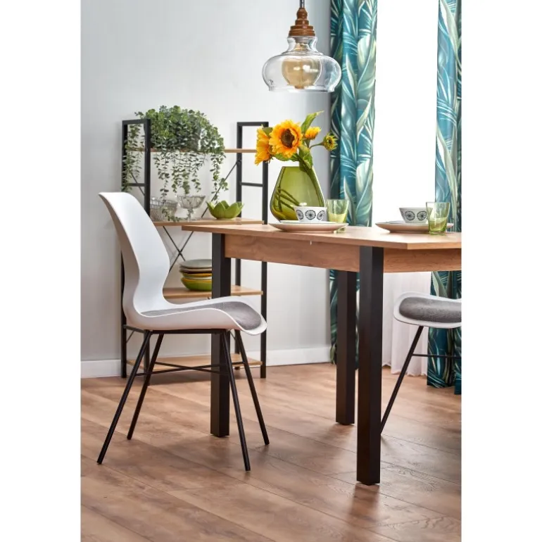 Oplev det stilfulde GINO bord i votan eg og Sort, perfekt til at forvandle dit spiseområde eller køkken. Dette Spisebord med udtræk er designet med fokus på både æstetik og funktionalitet. Med dimensioner på 100-130/60/75 cm passer bordet perfekt til både små og store rum. Det er lavet af lamineret spånplade, hvilket sikrer både holdbarhed og let vedligeholdelse. Bordpladen i votan eg giver et varmt og naturligt udseende, mens de Sorte ben tilføjer et moderne touch. Uanset om du har brug for ekstra plads til gæster eller en kompakt løsning til hverdagsbrug, er GINO bordet den ideelle løsning.