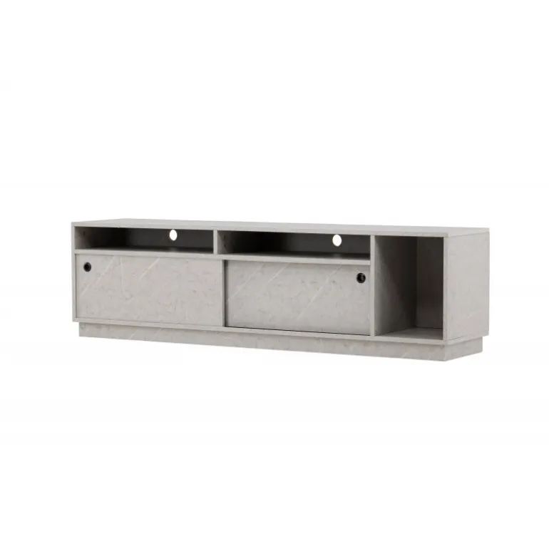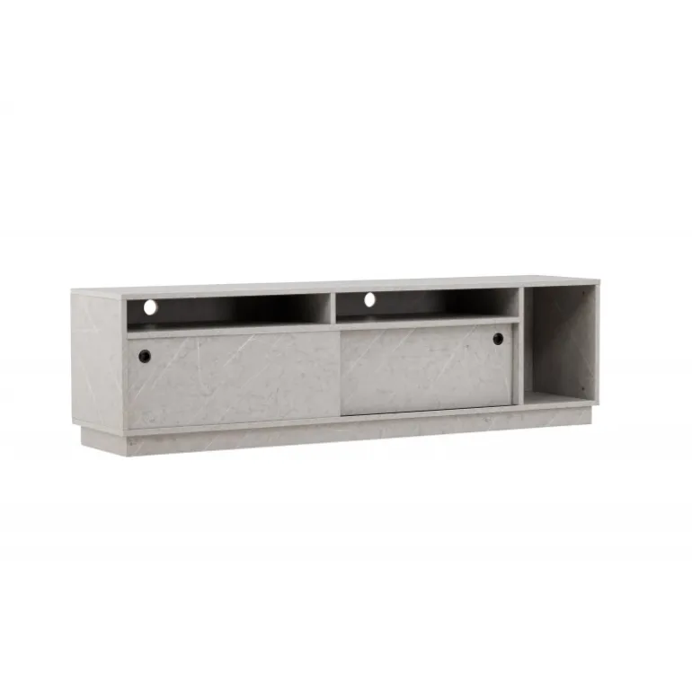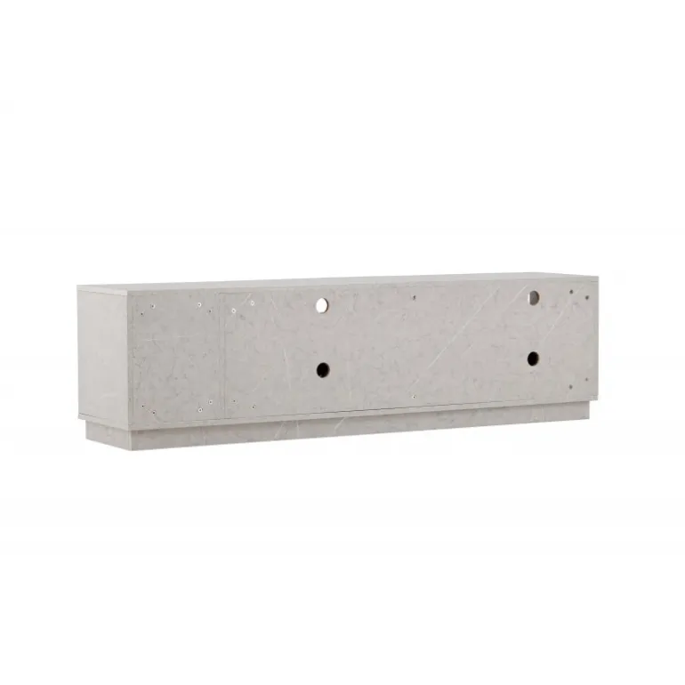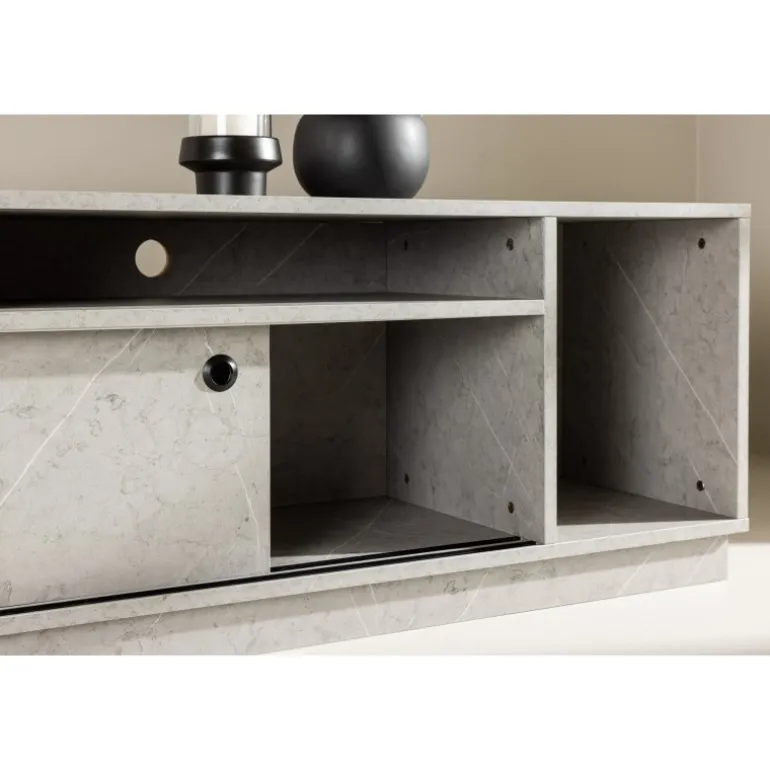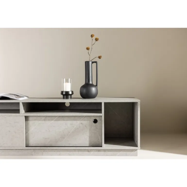 Skab en behagelig atmosfære i din stue med vores TV-reol i grå betonlook fra Girona-serien! Med sit sofistikerede udseende og holdbare overflade af grå melamin, løfter Girona ikke kun dit interiørdesign, men forbedrer også din oplevelse af at organisere dit rum. Girona TV-reolen kombinerer funktion og stil på en måde, der får dig til at føle dig som en designekspert. De to skydedøre, elegant designet, skjuler en rummelig hylde, der nemt rummer dine opbevaringsbehov. Hvordan ville det være at have alle dine enheder, kabler og fjernbetjeninger gemt væk bag dette elegante skab? Der er også åbne hylder, der giver dig mulighed for at vise dine yndlingsting frem og tilføje et personligt præg til dit værelse. Topoverfladen er også perfekt til at skabe den rette stemning i dit rum. Placer stilfulde lysestager og højttalere på toppen og nyd den ultimative TV-oplevelse i en atmosfære, du selv har skabt. Velkommen til et nyt niveau af interiørdesign med Girona!