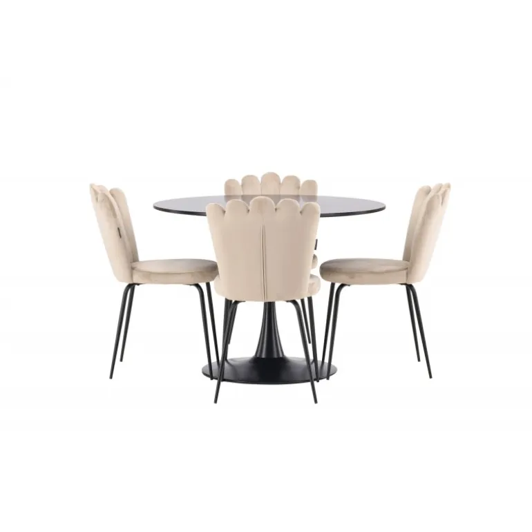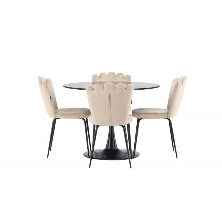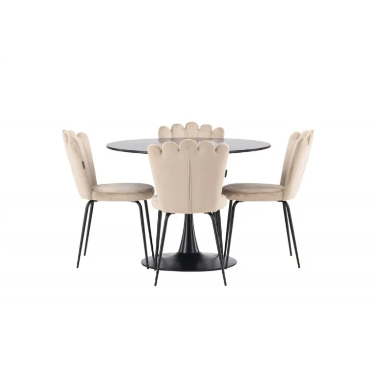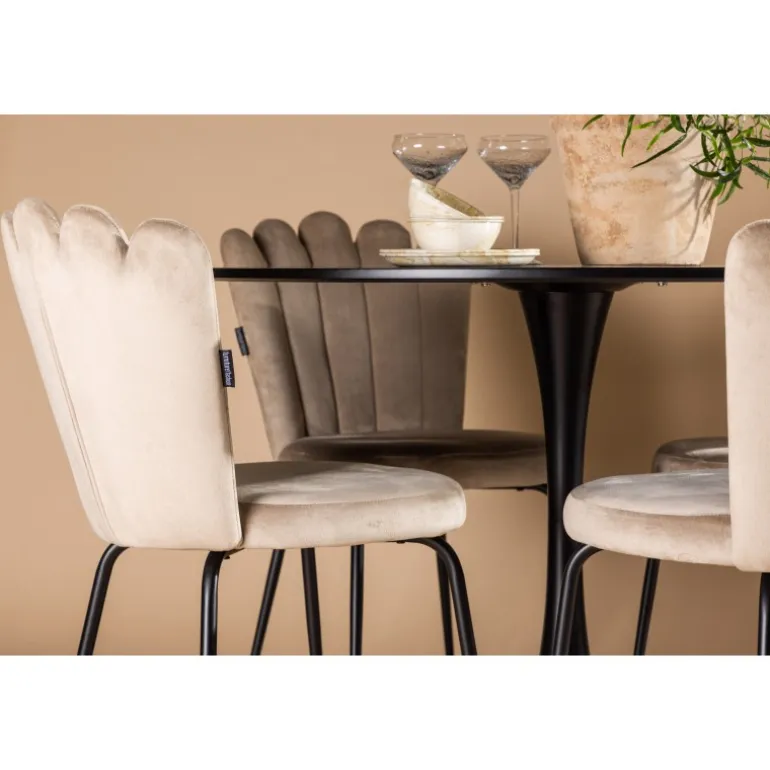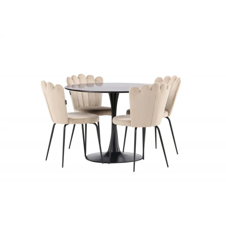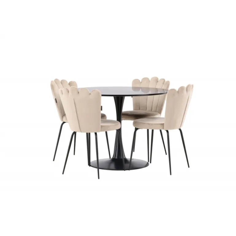 Skab en elegant blikfang i stuen! Glade spisebord har et stilfuldt skandinavisk design med en slank trompetfod i sort stål og en sort bordplade i MDF. Her sammen med vores populære spisebordsstole fra Limhamn-serien. Stolen har et indbydende design med dekorativ ryg i skaldform med dekorative syninger og et rundt sæde i smagfuldt beige fløjlsstof. Benene er i sort pulverlakeret metal. Her kan du sidde komfortabelt! Bordets dimensioner: 100 cm.