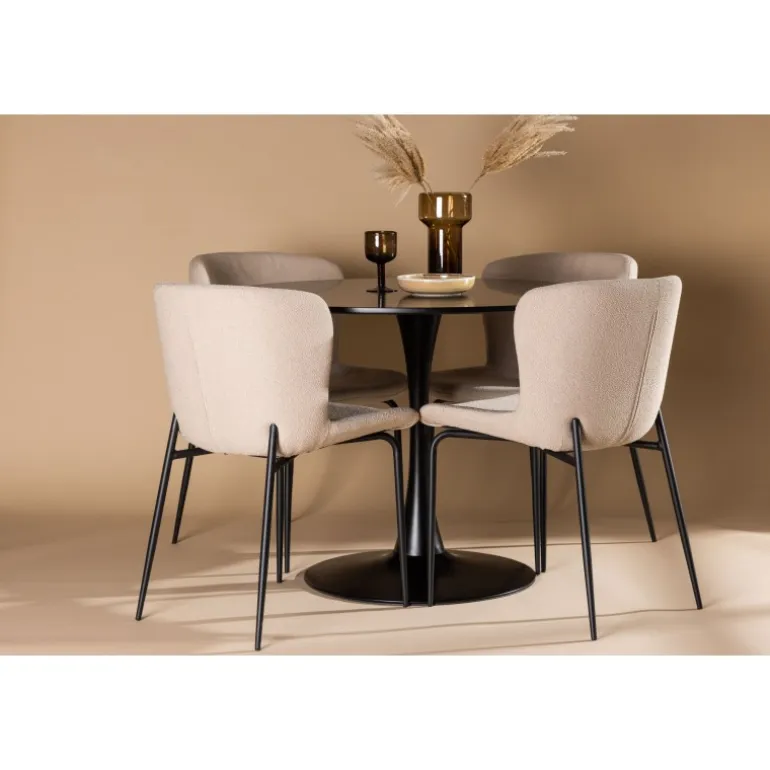 Moderne og indbydende! Glade spisebordet har et stilfuldt skandinavisk design med en slank trompetfod i sort stål og en sort bordplade i MDF. Her i perfekt kombination med vores grå spisebordsstole fra Modesto-serien. Stolen er fuldt polstret i gråt, pelsagtigt stof med stilfulde smalle ben i sort metal. Den let afrundede ryg og polstrede sædehynde giver ekstra komfort og forlænger behagelige måltider omkring spisebordet. Det skal føles godt at sætte sig ned til et dejligt måltid! Bordets dimensioner: 100 cm.