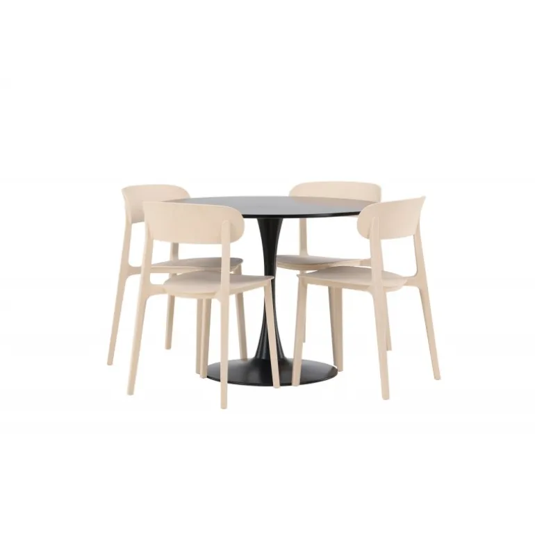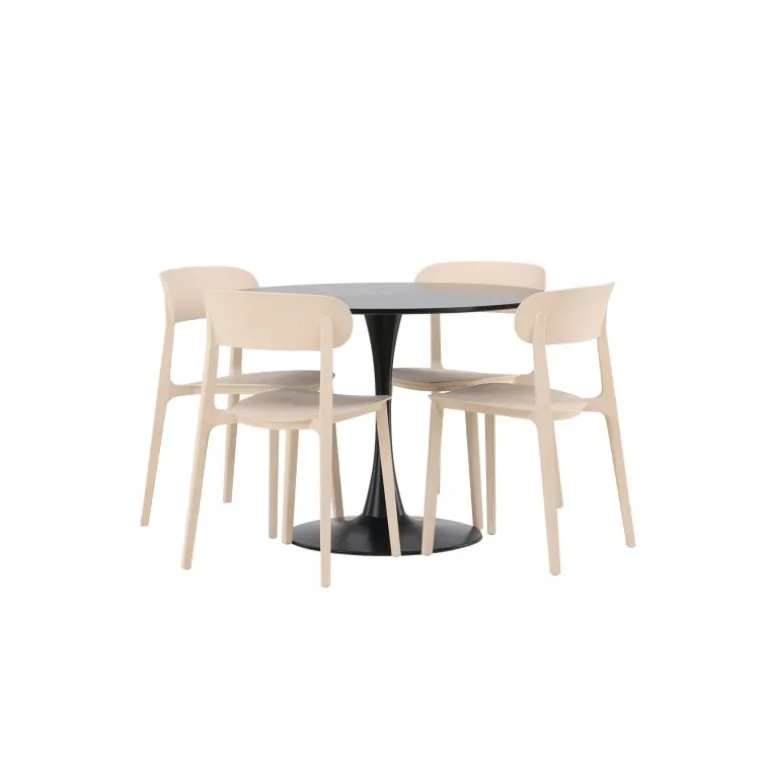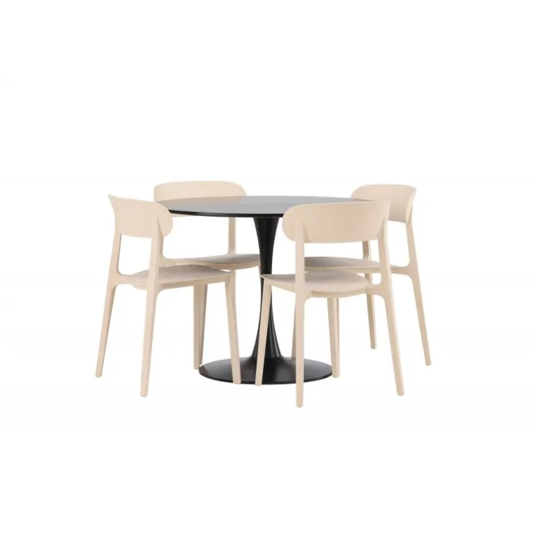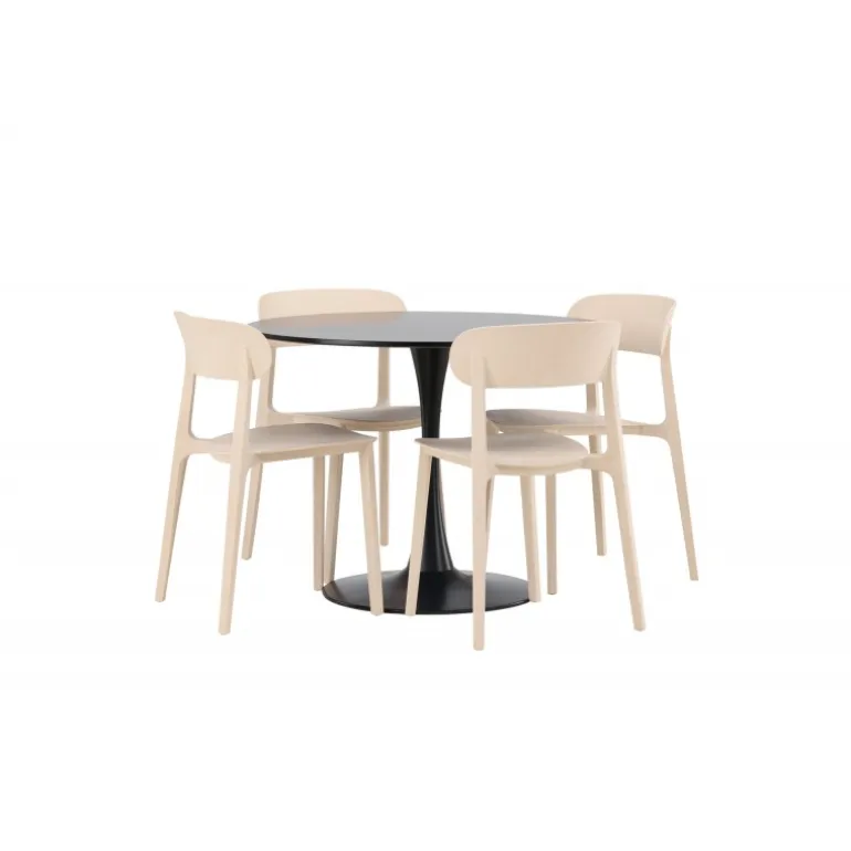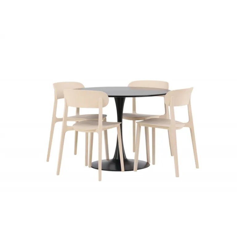 Enkle farver og stilfuldt design! Glade spisbord har et elegant skandinavisk design med en slank trompetfod i sort stål og en sort bordplade i MDF. Her i slank kombination med træstole fra Åstol-serien. Stolen er konsekvent lavet i en smagfuld lys-poleret farve i trækomposit med et luftigt design og nordiske lige former. Indret hjertet af dit hjem indbydende med en rund Spisebordssæt! Bordets dimensioner: 100 cm.