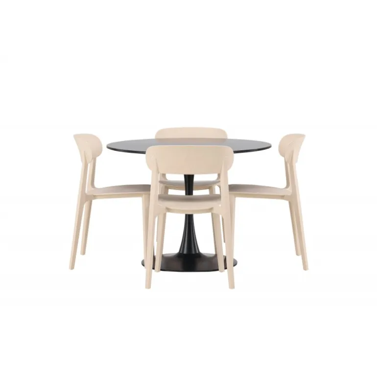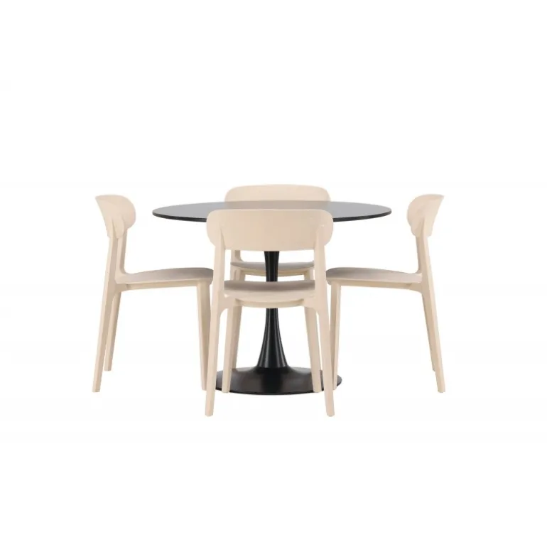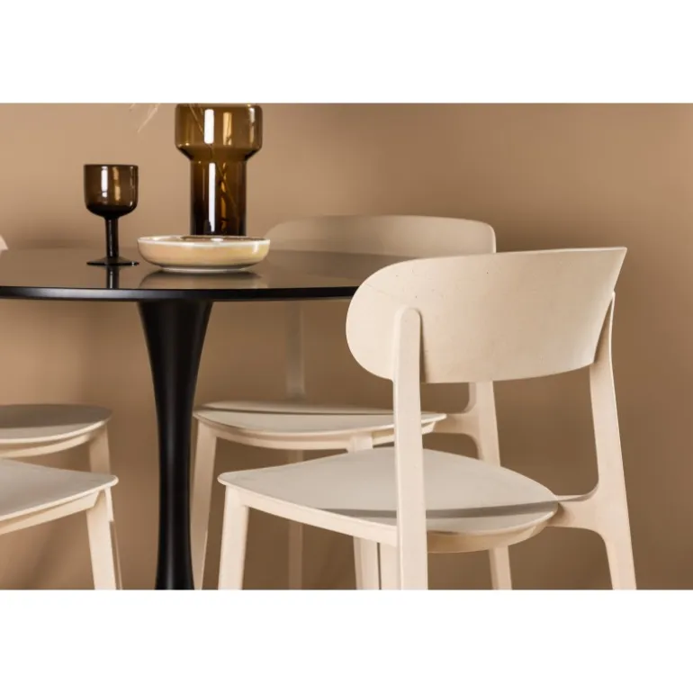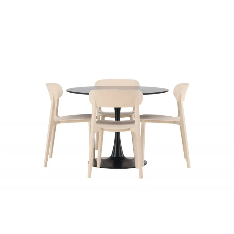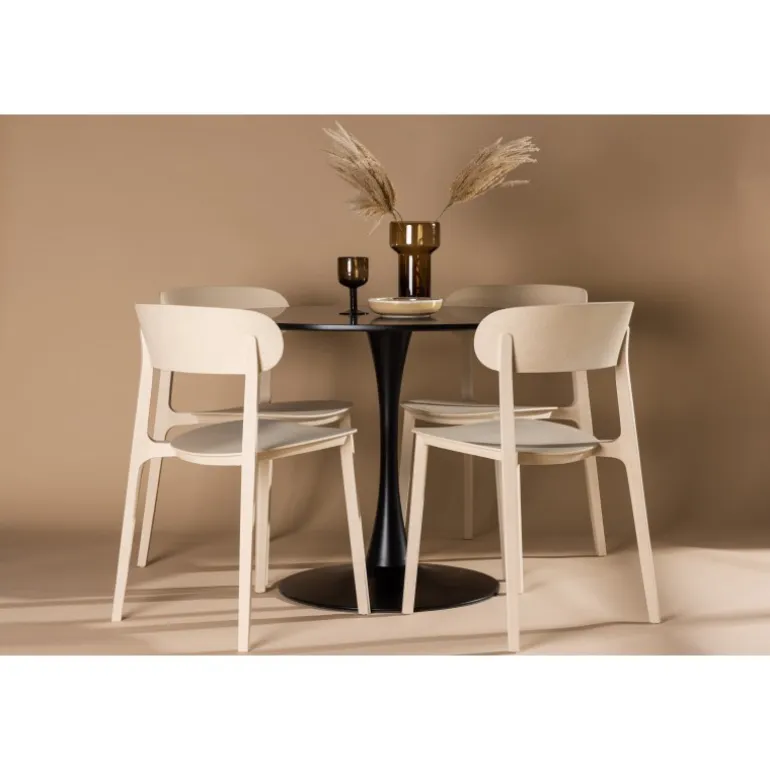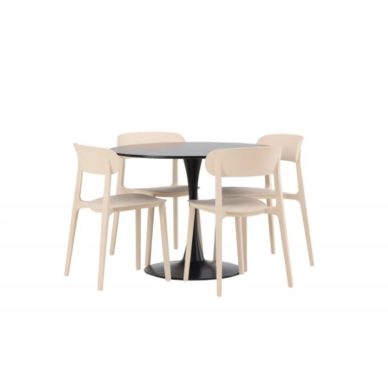 Enkle farver og stilfuldt design! Glade spisbord har et elegant skandinavisk design med en slank trompetfod i sort stål og en sort bordplade i MDF. Her i slank kombination med træstole fra Åstol-serien. Stolen er konsekvent lavet i en smagfuld lys-poleret farve i trækomposit med et luftigt design og nordiske lige former. Indret hjertet af dit hjem indbydende med en rund Spisebordssæt! Bordets dimensioner: 100 cm.