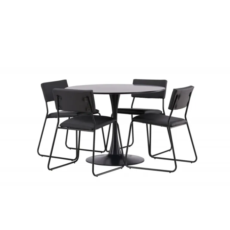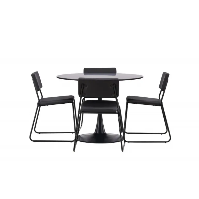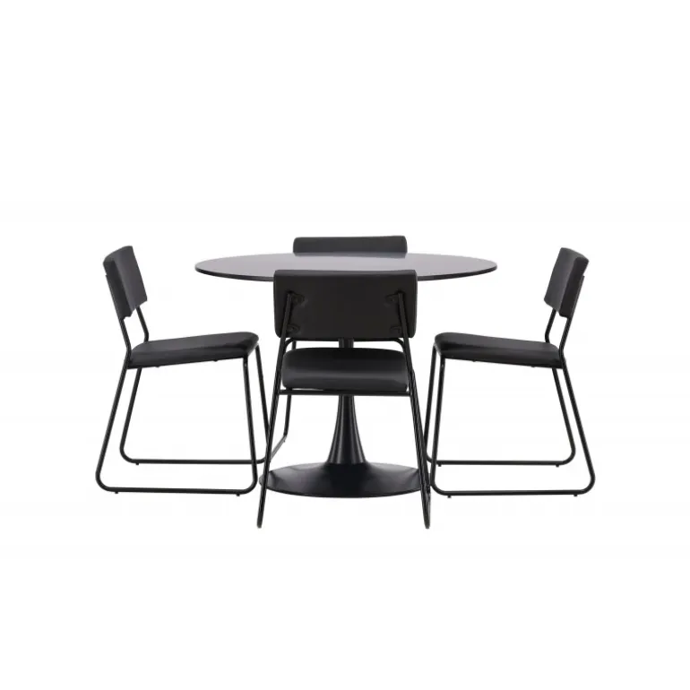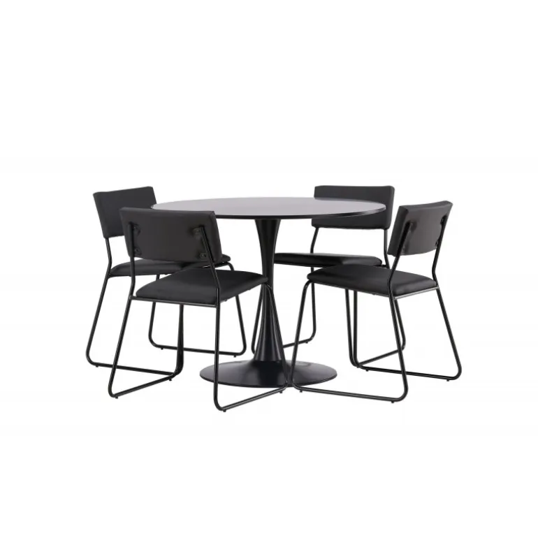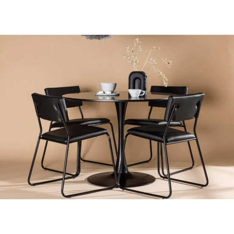 Minimalistisk og tidsløst – et Spisebordssæt med alle de rigtige funktioner! Glade spisebordet har et stilfuldt skandinavisk design med en slank trumpetfod i sort stål og en sort bordplade i MDF. Her sammen med vores sorte spiseborde fra Kenth-serien. Det minimalistiske, moderne design skaber en luftig følelse. Stolen har en ryg og sæde i sort polyurethanlæder og polyester samt dekorative smalle ben i jern. Dekorer hjemmets hjerte tidløst og stilfuldt! Bordets dimensioner: 100 cm.