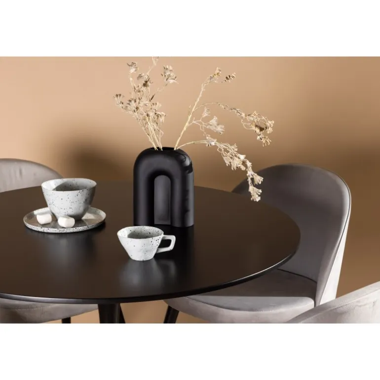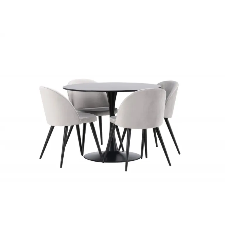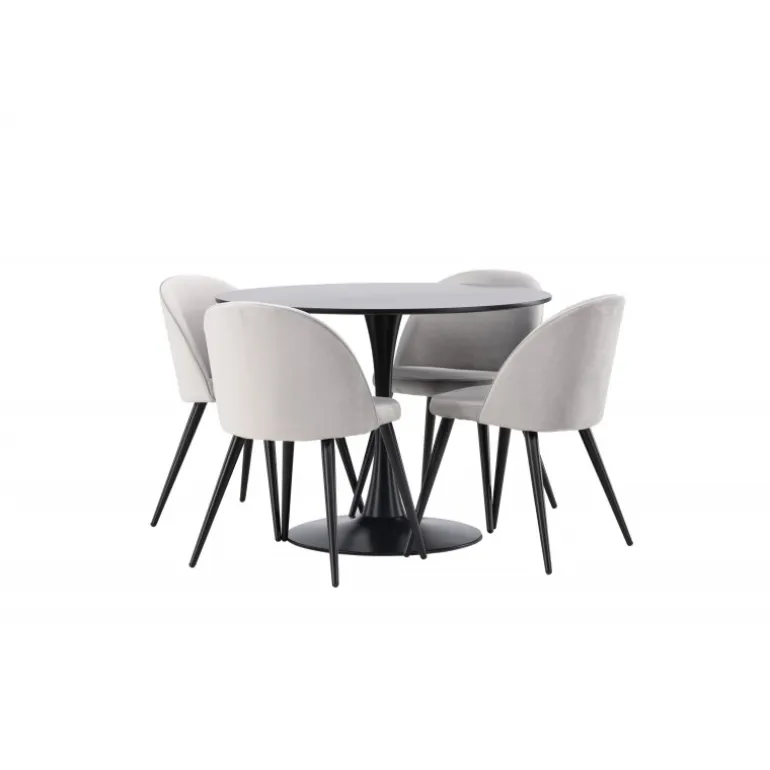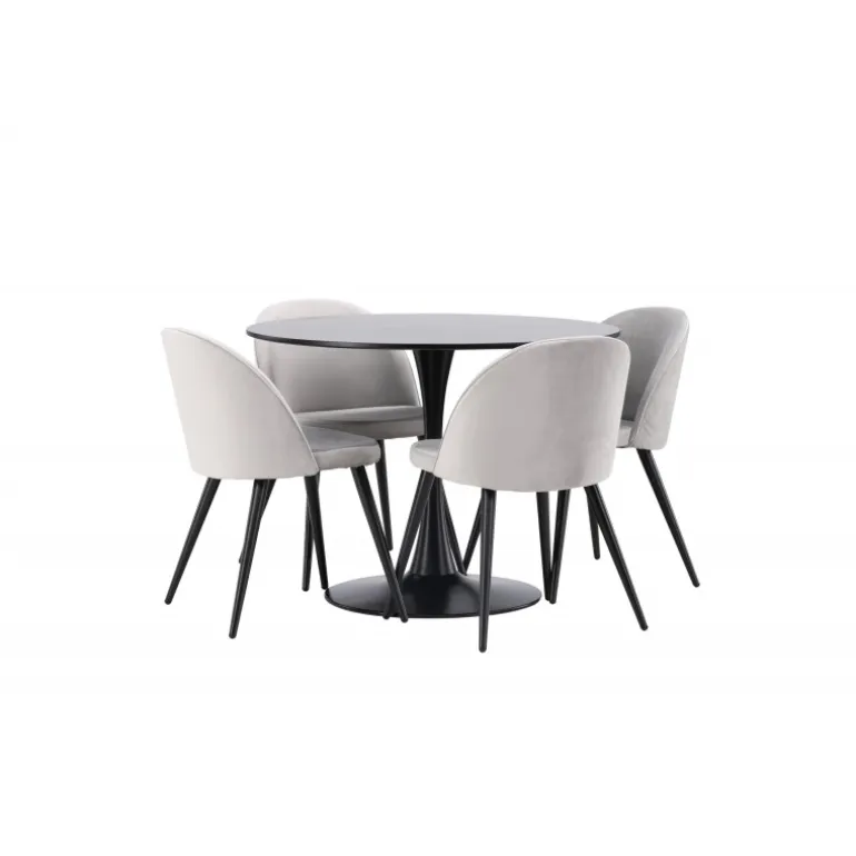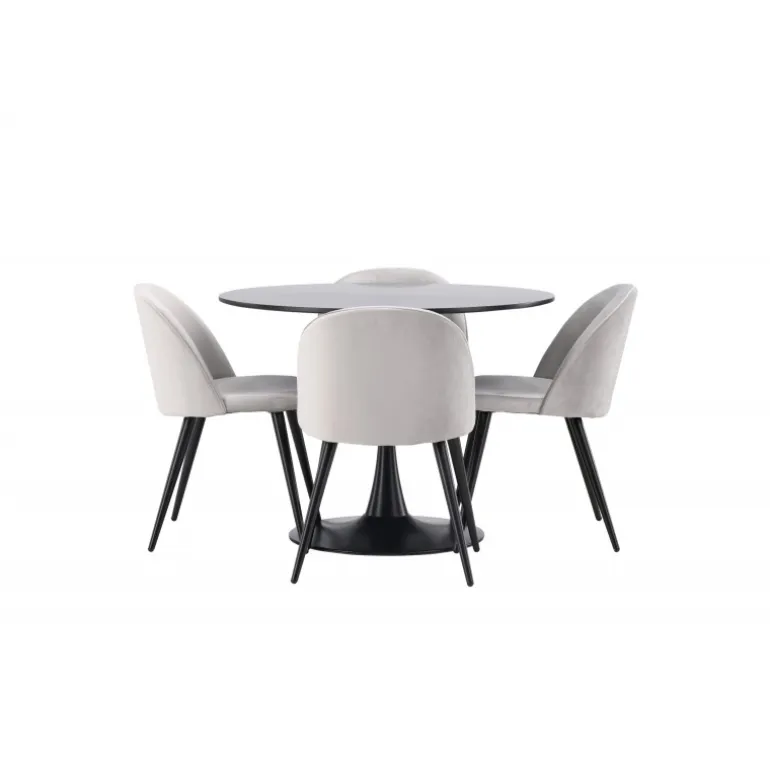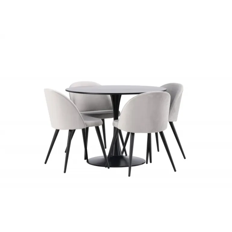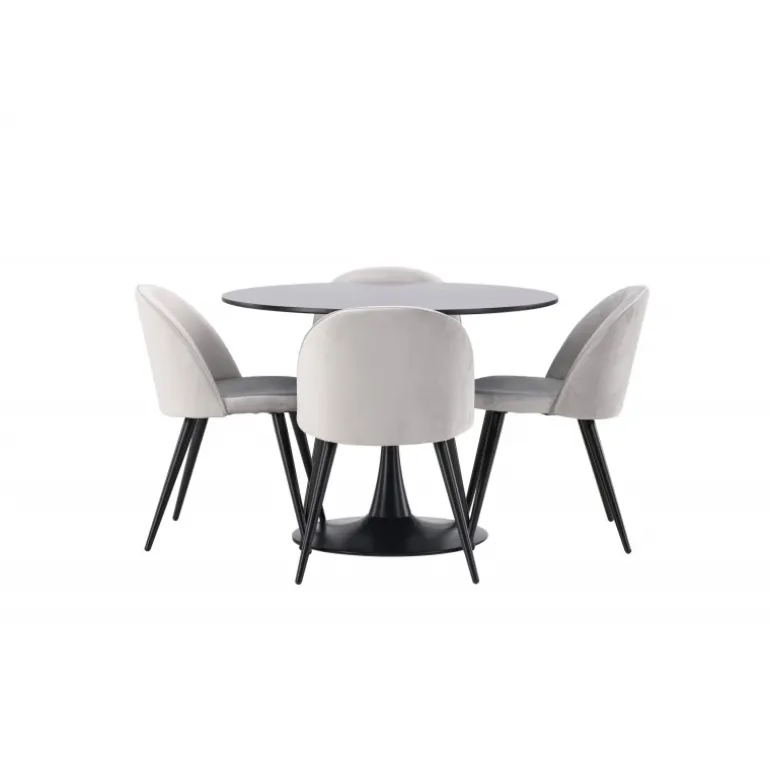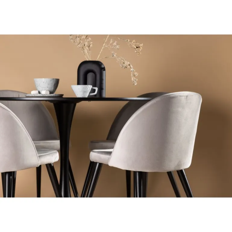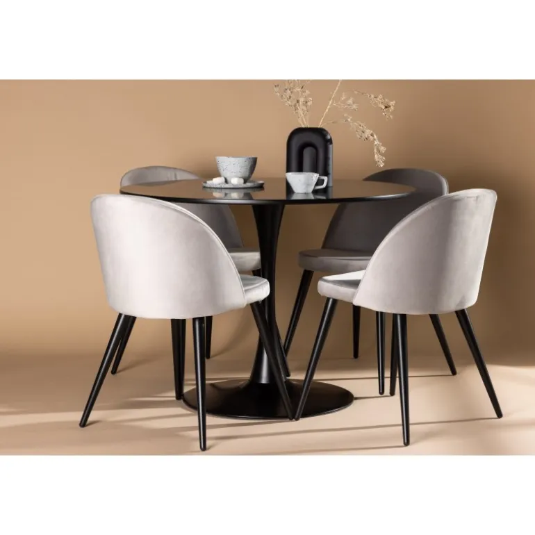 Kombiner behagelige farver med bløde former! Spisebordet Glade har et stilfuldt skandinavisk design med en slank trompetfod i sort stål og en sort bordplade i MDF. Her i perfekt kombination med vores grå spisebordsstole fra Velvet-serien. Stolen har et fuldt polstret design, ben i sort pulverlakeret metal og afrundet ryg og sæde i gråt velourstof med blød polstring. Her sidder du komfortabelt i lang tid! Bordets dimensioner: 100 cm.
