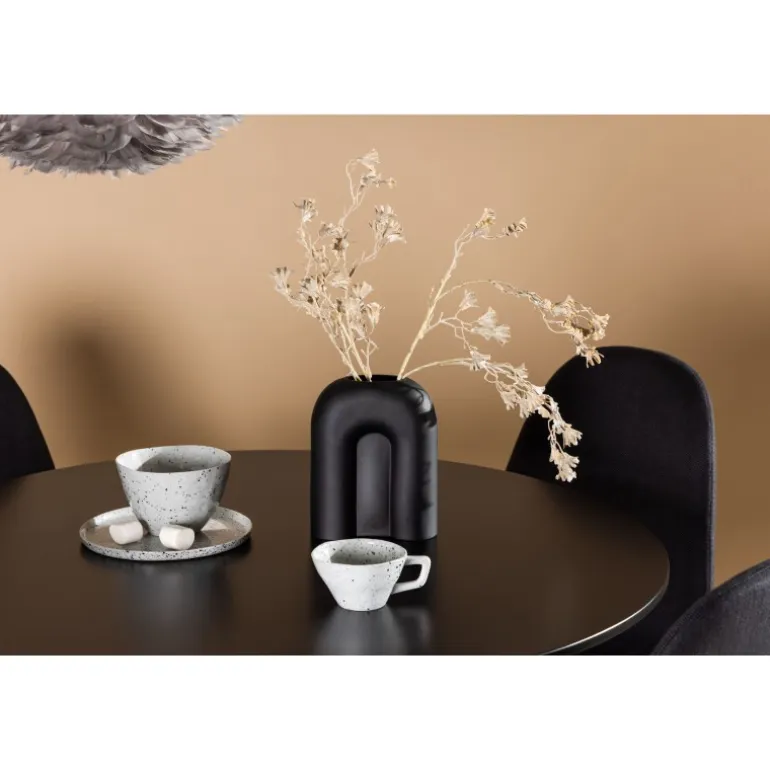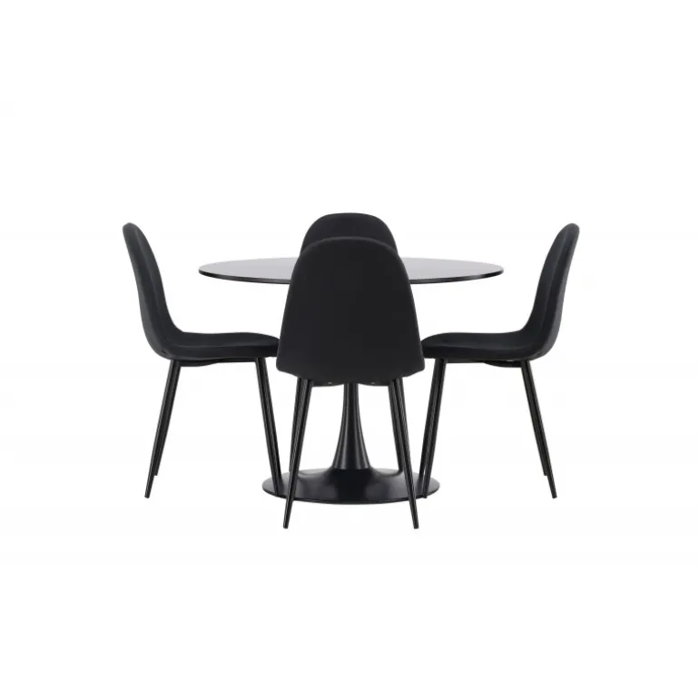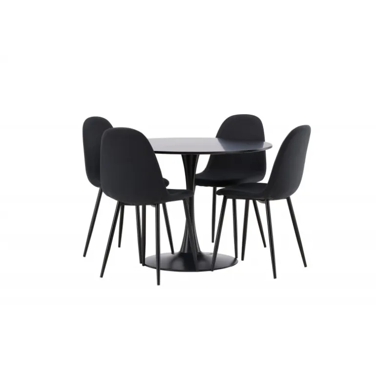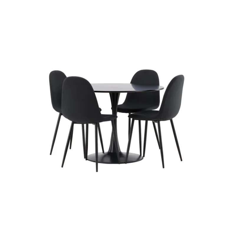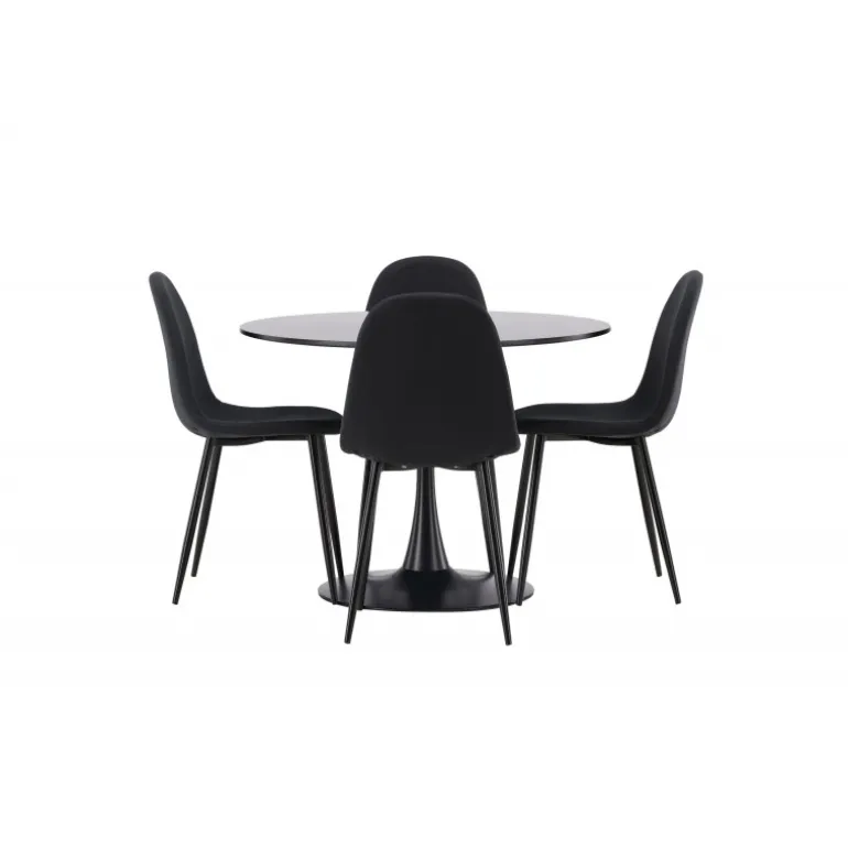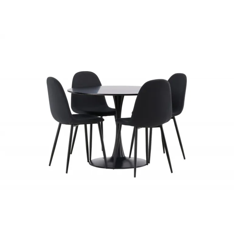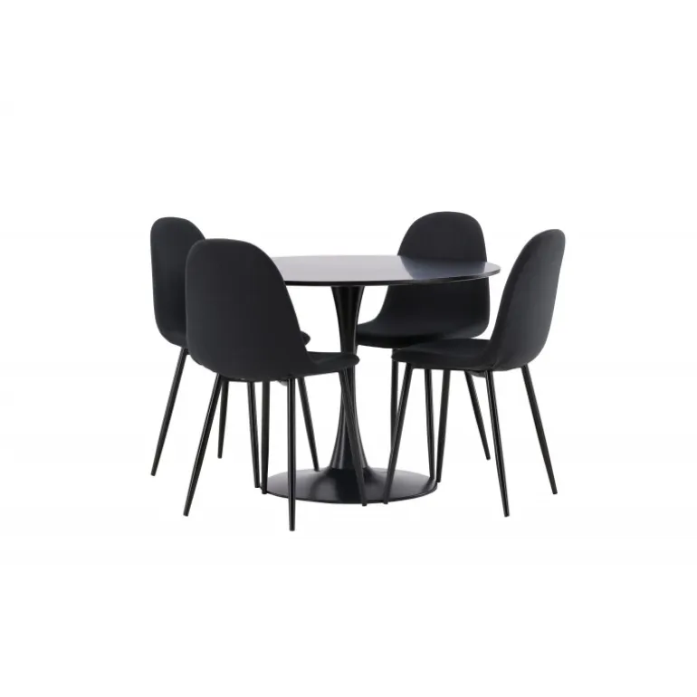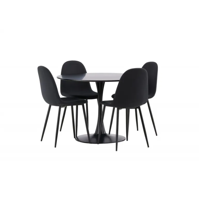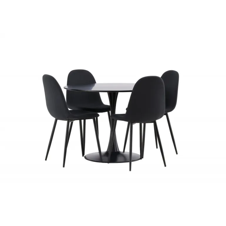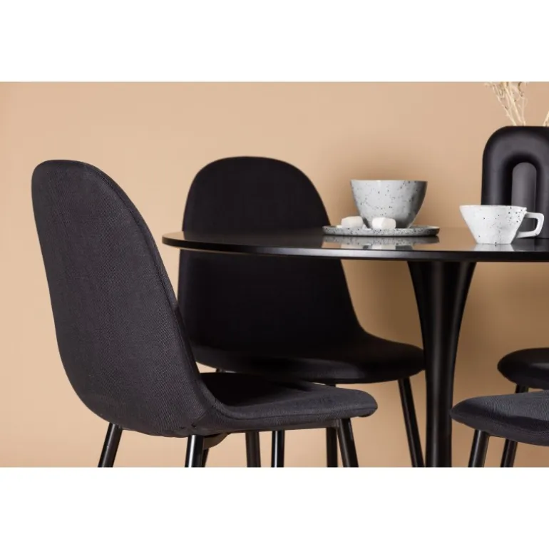 Glade Rundt Spisebordssæt har et stilfuldt skandinavisk design med en slank trompetfod i sort stål og en sort bordplade i MDF. Bordet er kombineret med sorte spisebordsstole fra Polar-serien. Stolen har et afrundet design med et klassisk udseende – lige så praktisk som tidløst. Ryglæn og sæde er polstret i sort polyesterstof og benene er i sort pulverlakeret metal. Her får du et matchende, komplet Spisebordssæt til stuen eller køkkenet! Bordets dimensioner: 100 cm.