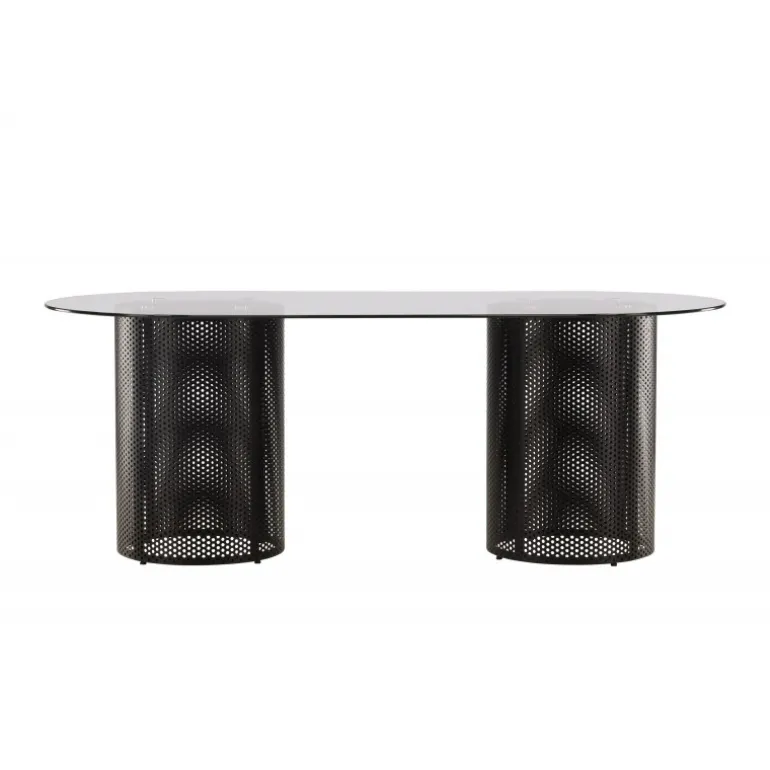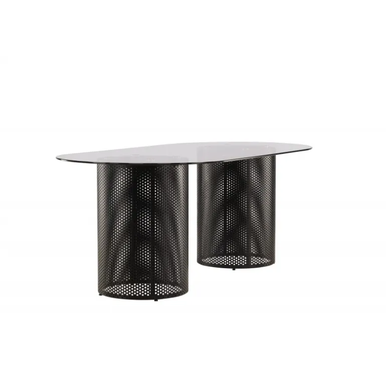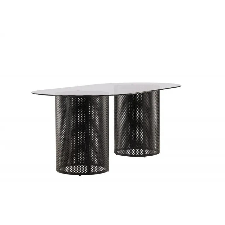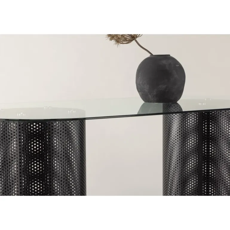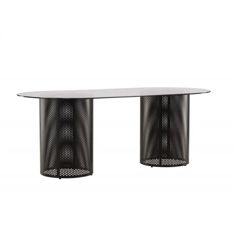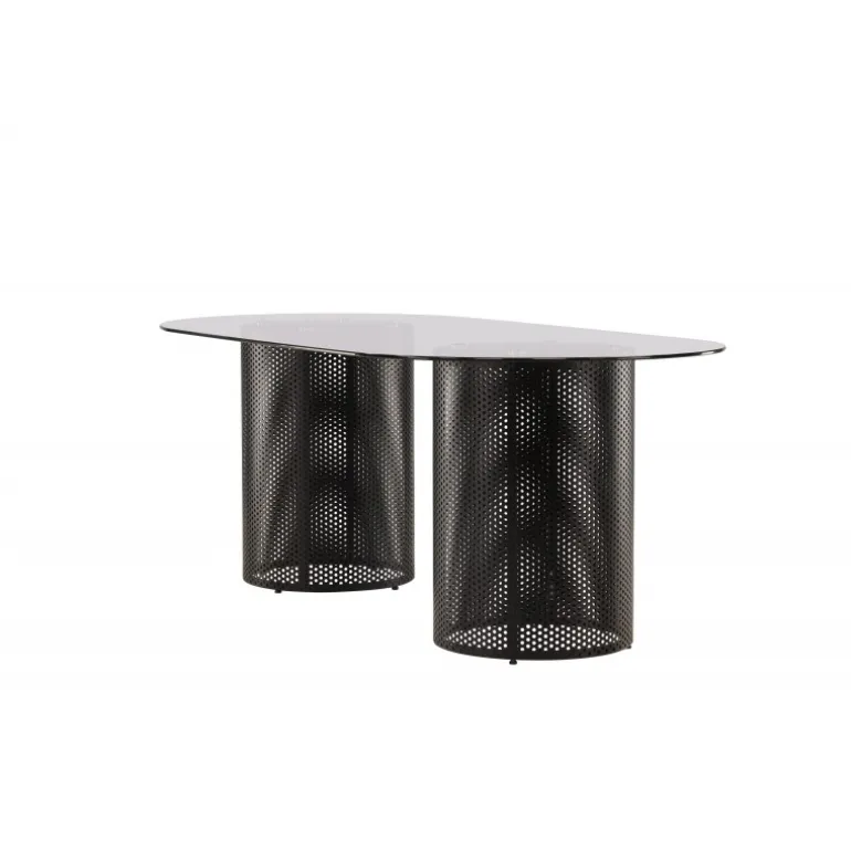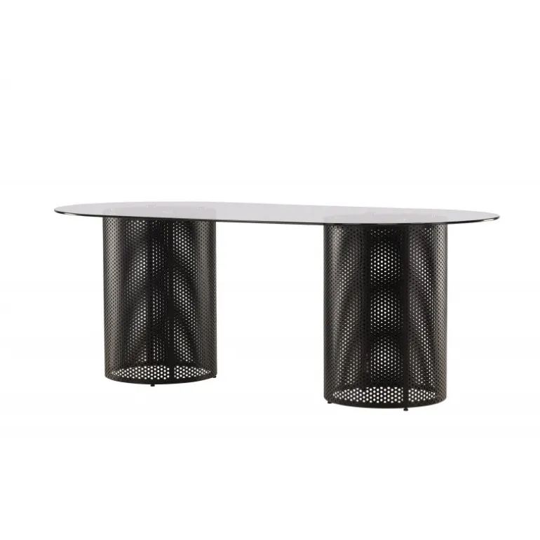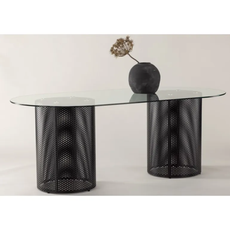 Det moderne spisebord, der imponerer! Dette spisebord fra Glasgow-serien tilhører den sjove kollektion og er både gennemtænkt og iøjnefaldende. Ovalt spisebordpladen er oval i klart glas, hvilket giver en luksuriøs elegance til helhedsindtrykket. De to cylinderformede ben er robuste i sort stål og har et smagfuldt industrielt design, der fanger øjet. Match med et par stilfulde spisebordsstole, og du får en komplet Spisebordssæt til fremtidige måltider!