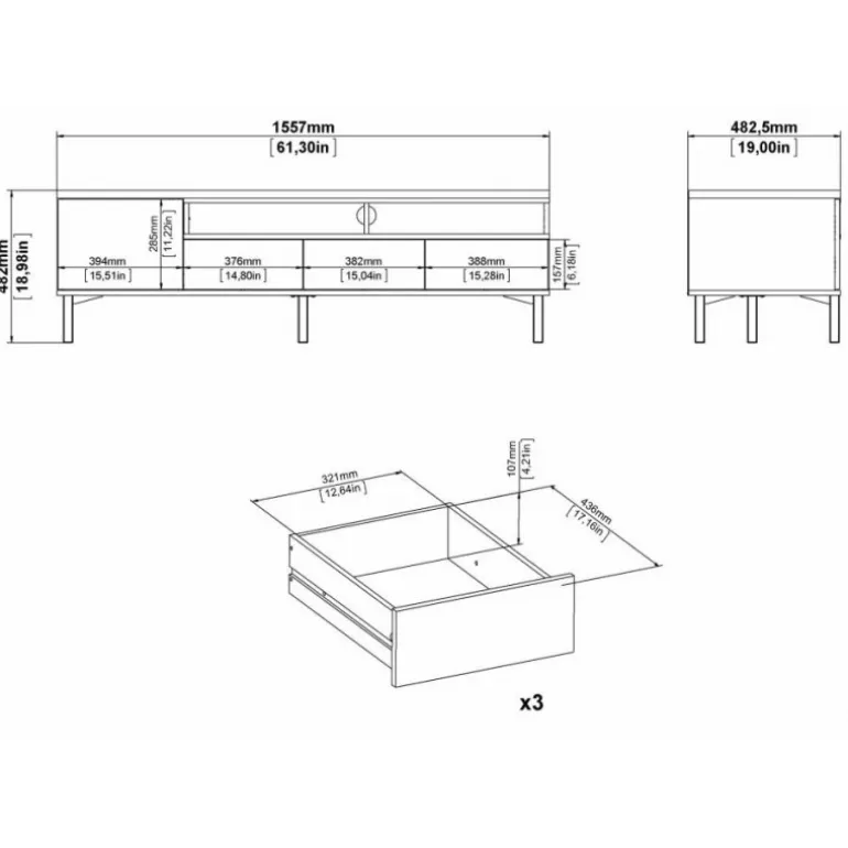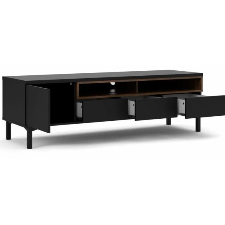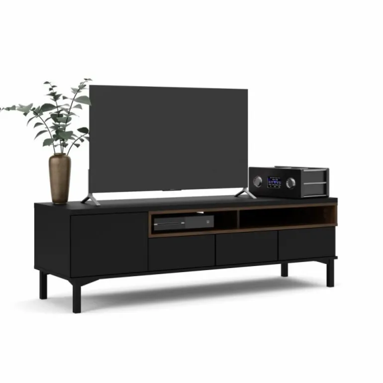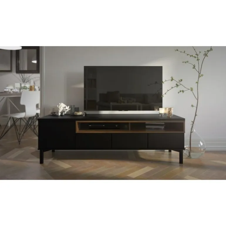 Elegant, sort tv-bord udført i praktisk design med 6 opbevaringsrum, heraf 2 åbne i smart valnødstruktur. Funktionalitet og æstetik sammensmeltes på elegant vis i dette flotte tv-møbel.