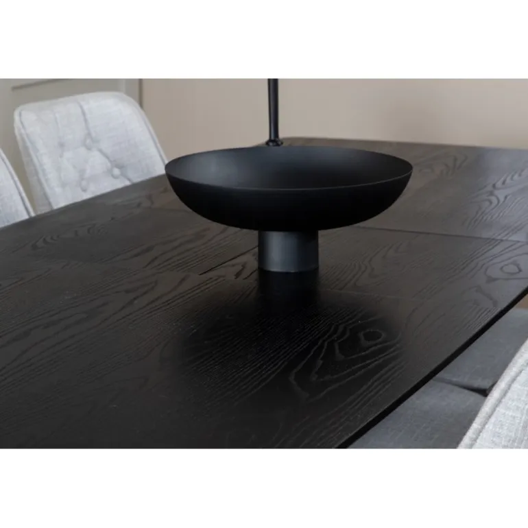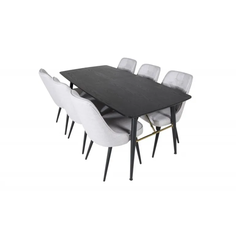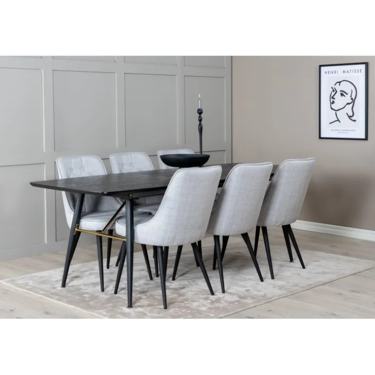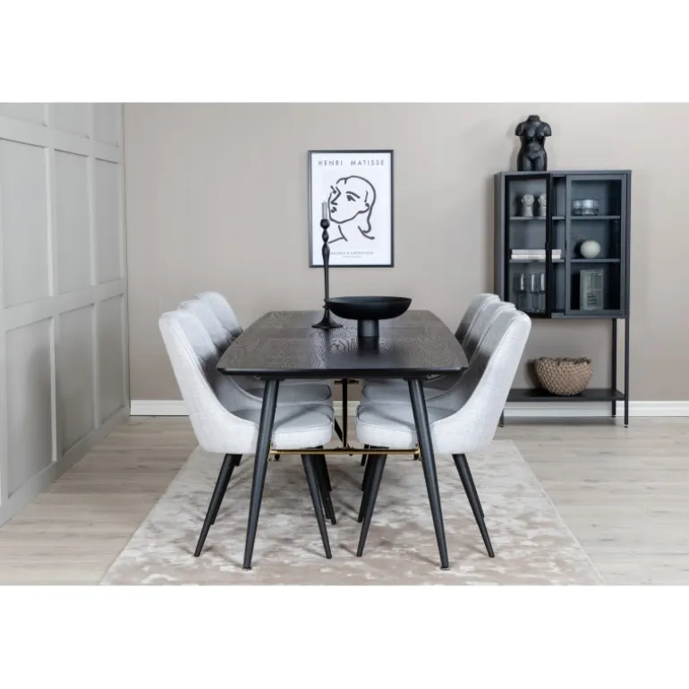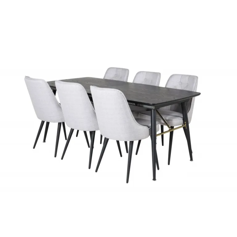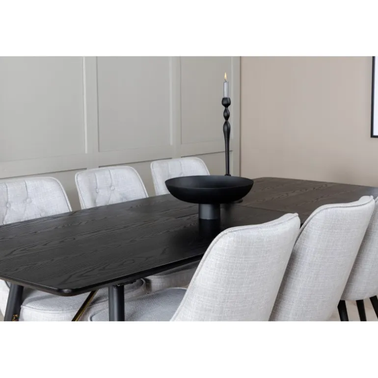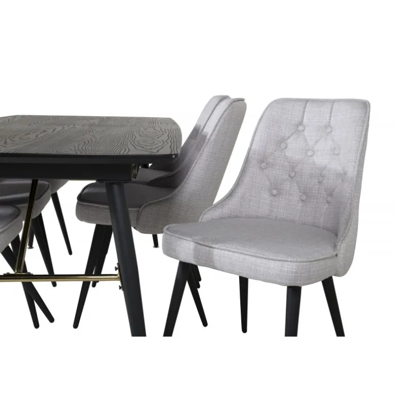 Moderne og elegant. Kombinationen af vores udtrækkelige spisebord i Guld-serien og vores luksuriøse grå spisestuestole Velvet skaber et spiseområde, man længes efter at komme hjem til. Dette sæt er det perfekte valg for dem, der ønsker at tilføje et strejf af luksus og stil til deres hjem. Sort og guld farver kombineret med MDF, krydsfiner og stål materialer giver både holdbarhed og et stilfuldt udseende.