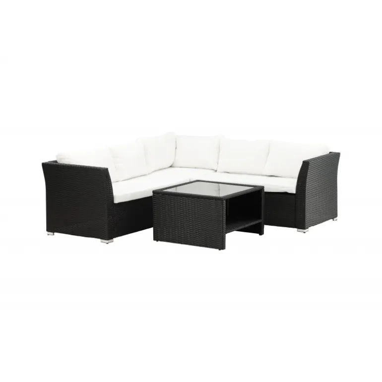 Haiti er en moderne loungesæt i sort kunstig rattan af høj kvalitet, perfekt til terrassen eller udendørsrum denne sommer. Loungesæt – Havemøbelsættet består af en modulopbygget hjørnesofa, hvilket gør det muligt at placere den på flere måder, med 4 sæder og en hjørnedel. Hvide bløde hynder og et rektangulært sofabord med en reliefhylde og en sort glasbordplade er inkluderet. Dimensioner: 194×194 cm. Let samling kræves. Nyd komforten og de sene sommeraftener med dine kære! Plejeanvisning: Konstrite er et plastmateriale, der er perfekt til vores skandinaviske klima. Materialet er UV-resistent og kan modstå vejr og vind. Det faktum, at det er UV-resistent, betyder, at møblerne ikke falmer. Vi anbefaler dog altid at opbevare møblerne under en møbelbeskyttelse eller ellers tørt og køligt for at forlænge levetiden.