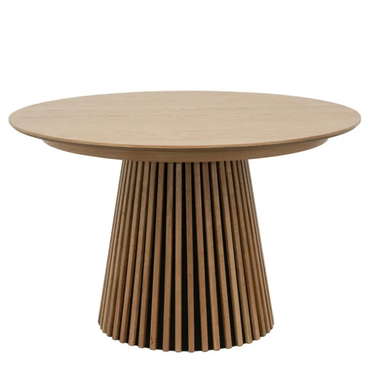 Det smukke Hammel rundt udtræksbord i natur eg kombinerer skandinavisk design og praktisk funktionalitet. Med en diameter på Ø140 cm i standardstørrelse er bordet ideelt til hverdagens måltider – og når der skal være plads til gæster, kan bordet nemt udvides til 190 cm eller 240 cm ved hjælp af de to medfølgende tillægsplader à 50 cm. Bordet rummer dermed op til 10 personer og er oplagt til både store og små selskaber.