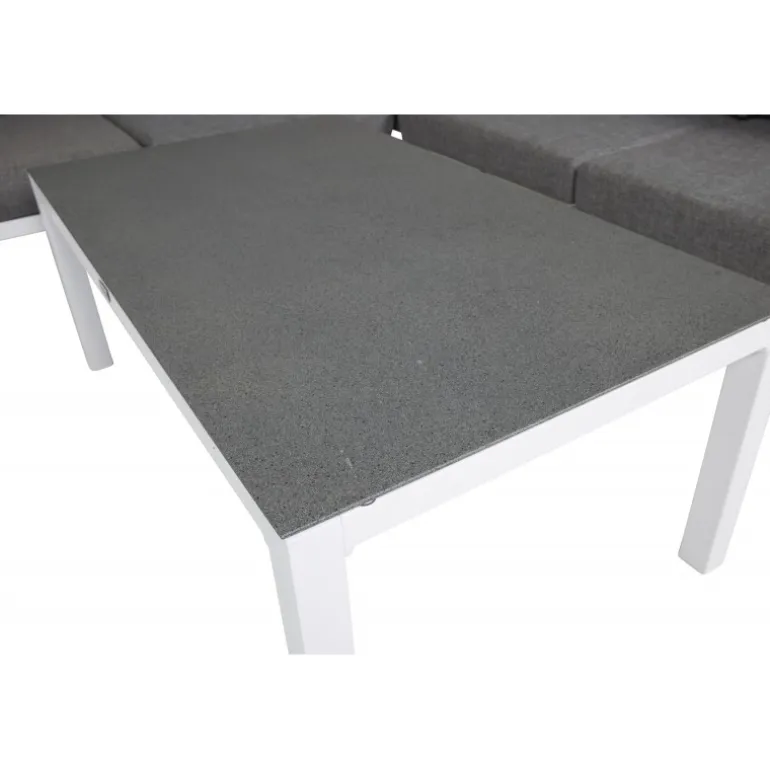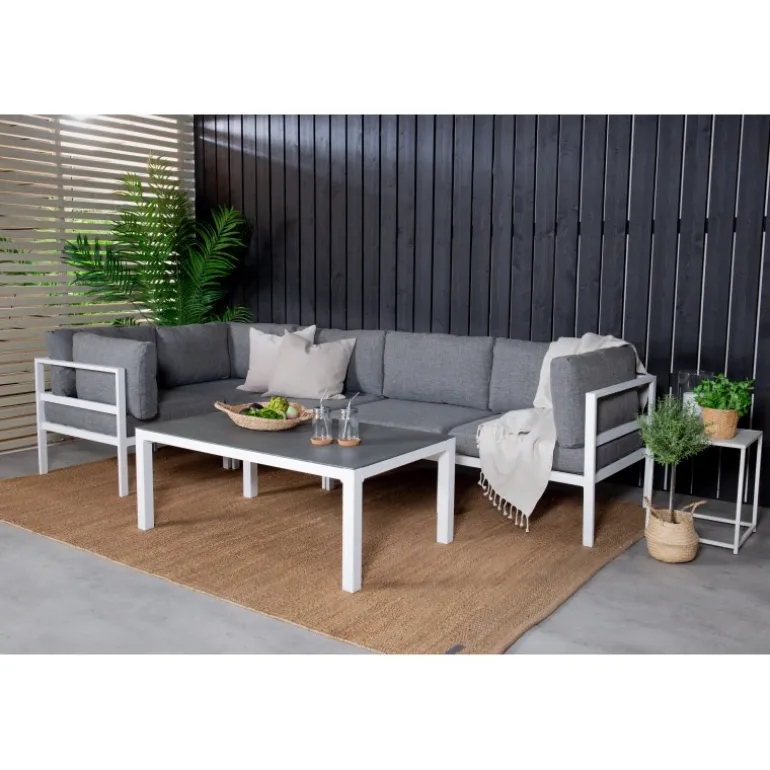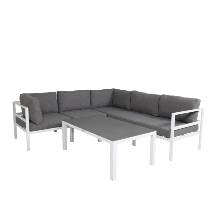Med bærbare moduler kan du tilpasse og bygge den lounggruppe, du altid har drømt om! Denne hjørnedel tilhører Copacabana-serien og er i hvid aluminium med bløde grå puder for ekstra komfort. Med hjælp fra dette modul kan du skræddersy din sofagruppe efter smag og plads. Her sammen med et sofabord fra samme serie. Bordpladen er i gråt sprayglas og basen i hvid aluminium for at matche sofaen. Tilpas til din særlige terrasse!