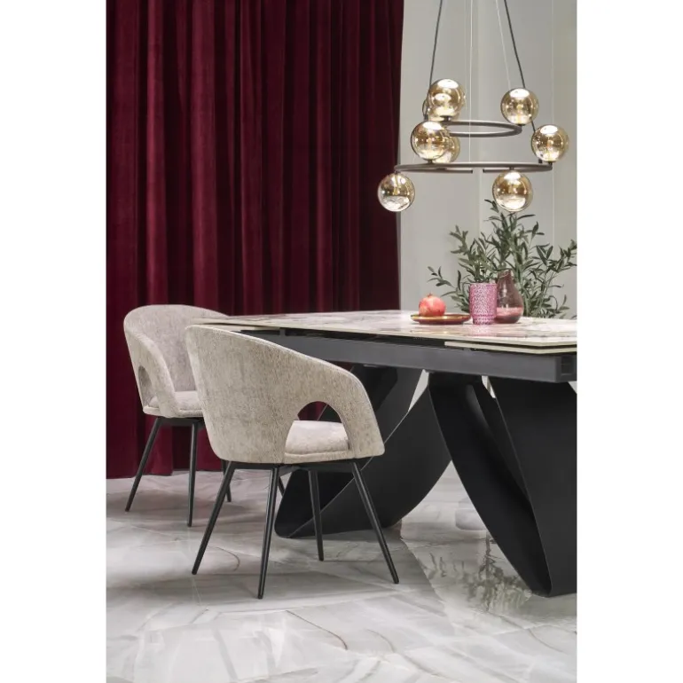 - Design: Elegant beige marmorbordplade og Sorte ben passer til enhver moderne spisestue eller køkken.