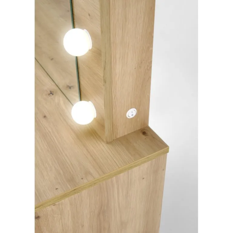 Oplev den perfekte blanding af stil og funktionalitet med vores HOLLYWOOD Sminkebord i eg. Dette elegante Sminkebord er fremstillet af lamineret spånplade, hvilket sikrer holdbarhed og en moderne finish. Med integrerede LED-lys skaber det en behagelig arbejdsmiljø. Dets kompakte dimensioner på 94/43/140 cm gør det ideelt til både små og store soveværelser . Sminkebord leveres i to kasser og har en nettovægt på 31.000 kg.