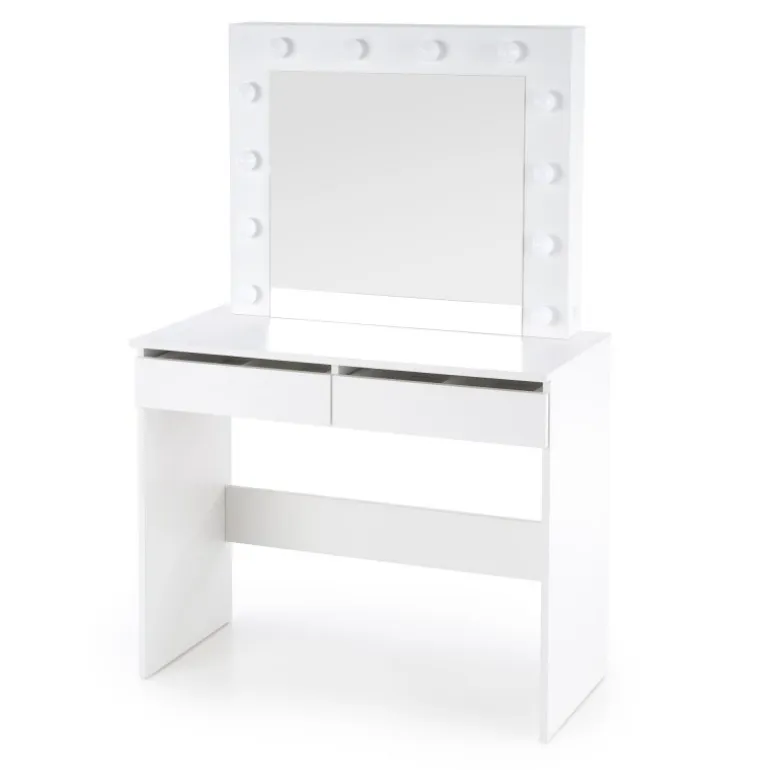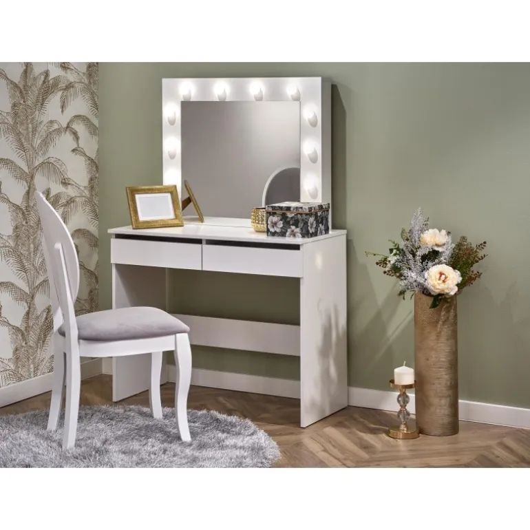 HOLLYWOOD Sminkebord med spejl i hvid farve er det perfekte valg til dit soveværelset. Moderne design kombineret med funktionalitet gør dette bord ideelt til både at smikne sig og studier. Bordpladen er lavet af lamineret spånplade, der sikrer holdbarhed og let vedligeholdelse. Med LED-lys integreret i designet får du en stilfuld og praktisk løsning, der lyser dit arbejdsområde op. Med dimensionerne 94/43/140 cm passer dette Sminkebord perfekt ind i de fleste rum, og dets hvide finish tilføjer et elegant touch til enhver indretning.
