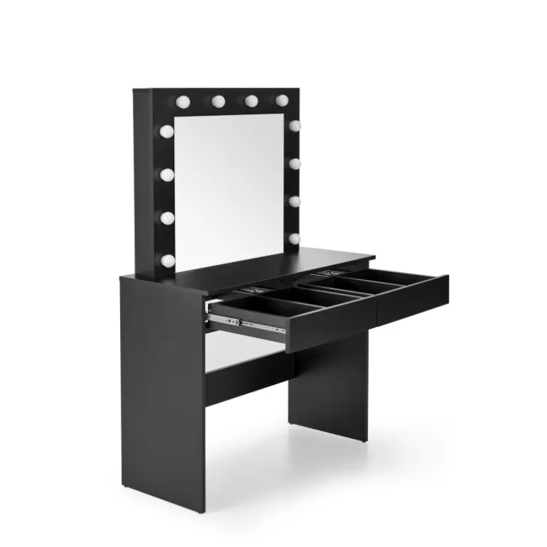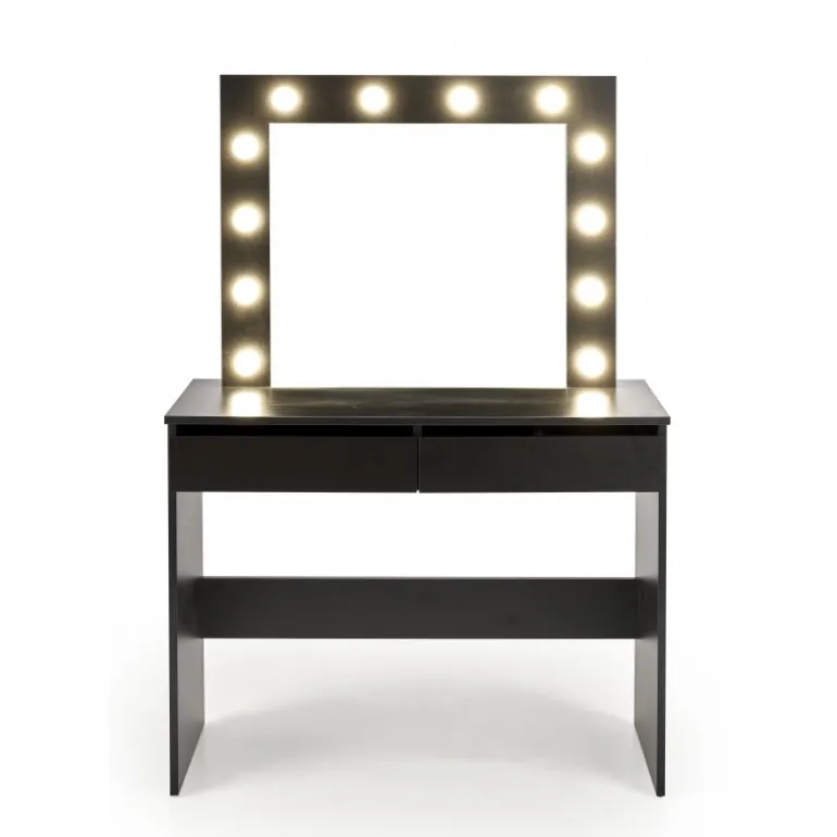 Oplev en moderne og elegant Sminkebord i Sort. Dette skrivebord er designet til at forbedre dit soveværelse eller arbejdsplads med et stilfuldt og funktionelt møbel. Lavet af holdbare laminerede spånplader og udstyret med indbyggede LED-lys, tilbyder dette Sminkebord både holdbarhed og æstetisk appel. Med dimensionerne 94/43/140 cm passer det nemt ind i de fleste værelser mens den Sorte farve tilføjer et strejf af sofistikation.